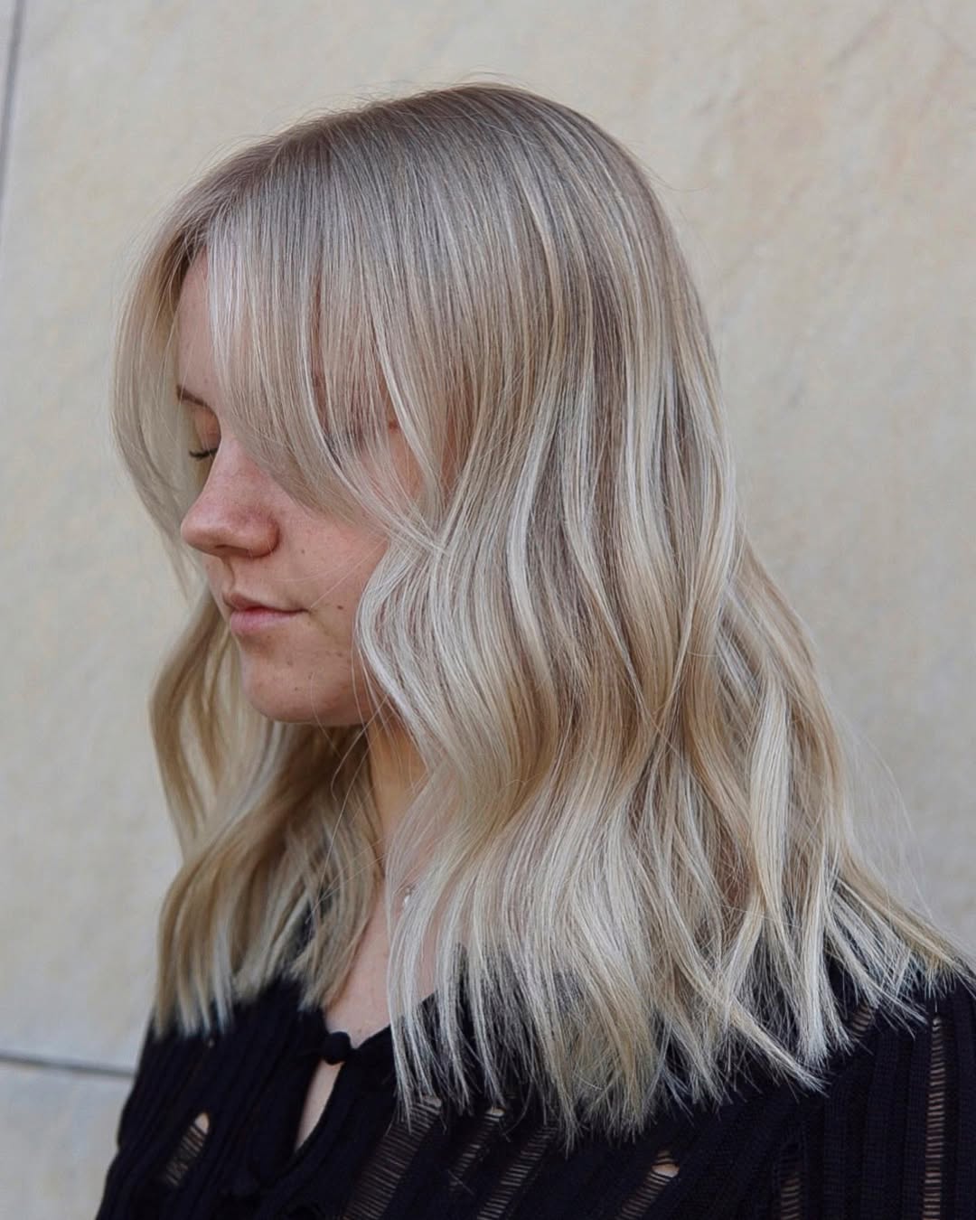 Harmonize a medium-to-long hairstyle with timeless bangs. Versatile and chic blonde bangs complement various face shapes. Keep dry shampoo on hand to maintain a fresh look for your fringe between washes.
