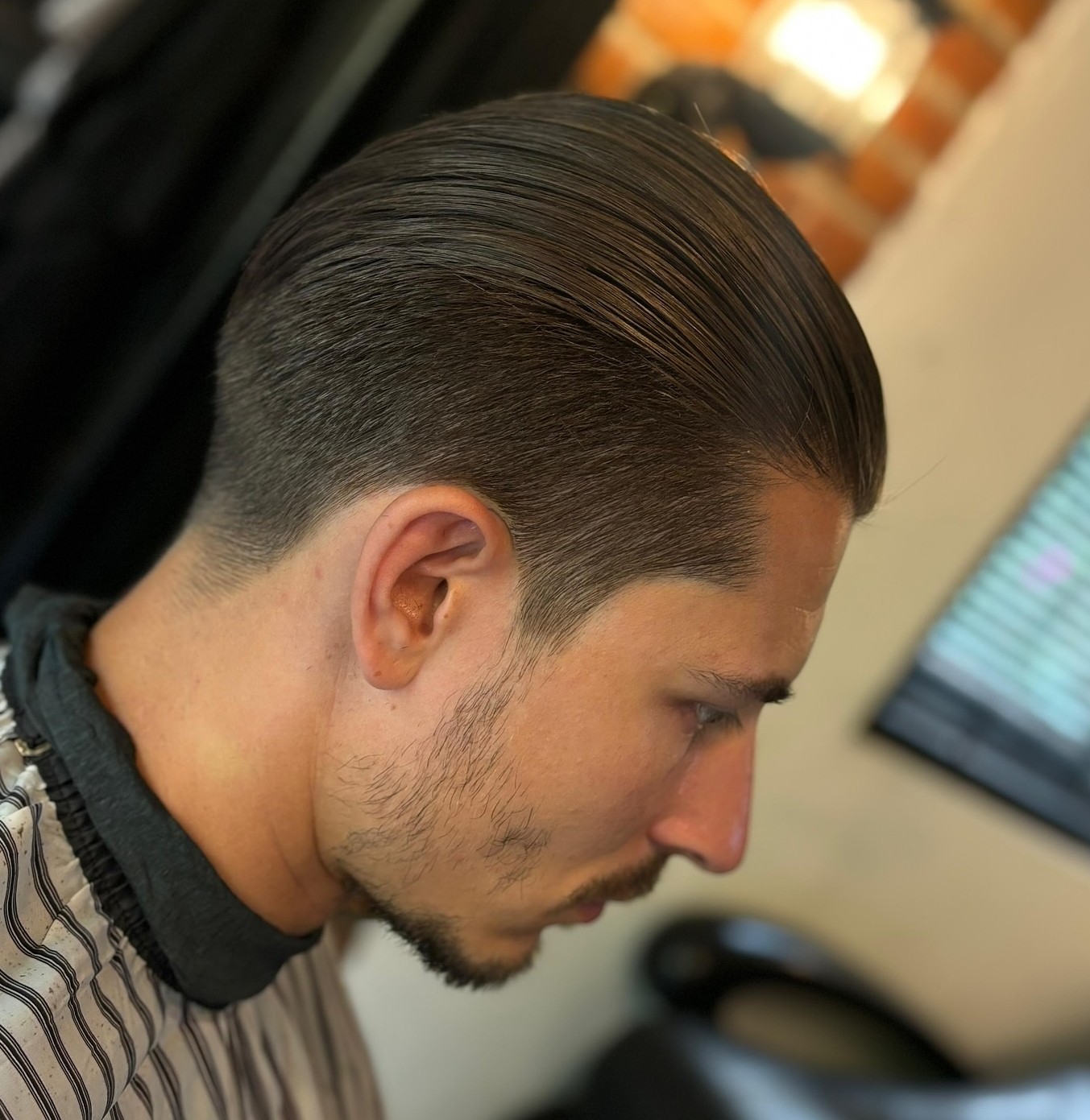 The slick back with a fade is like a contemporary twist on a timeless classic. The versatility of fade allows you to go from mid-taper haircut to skin fade, so you can effortlessly adjust the length of the sides.