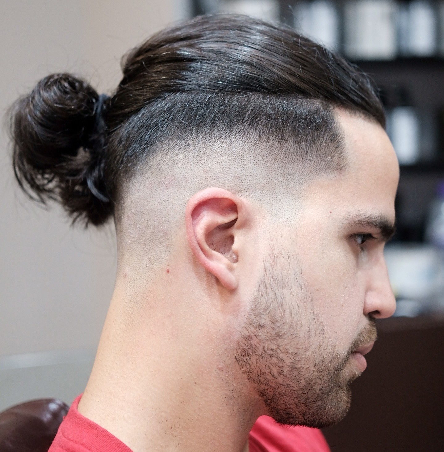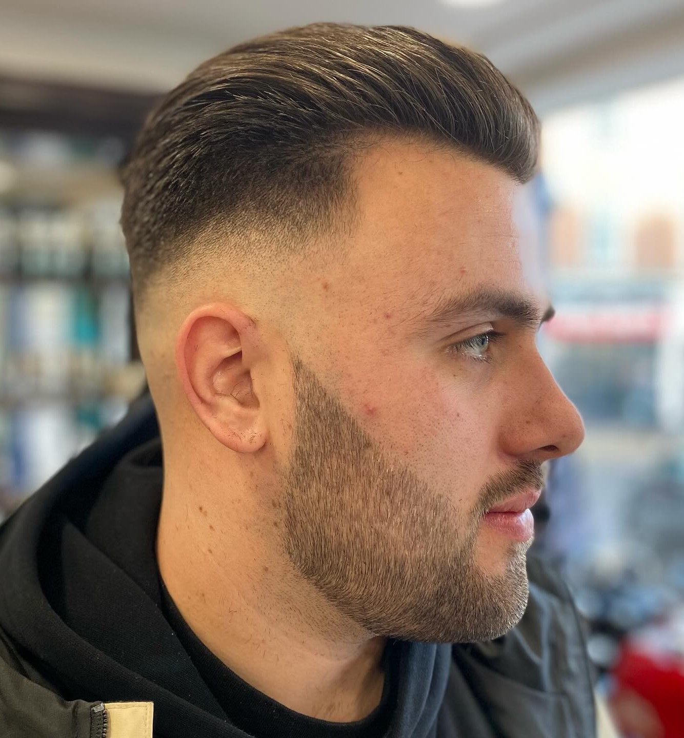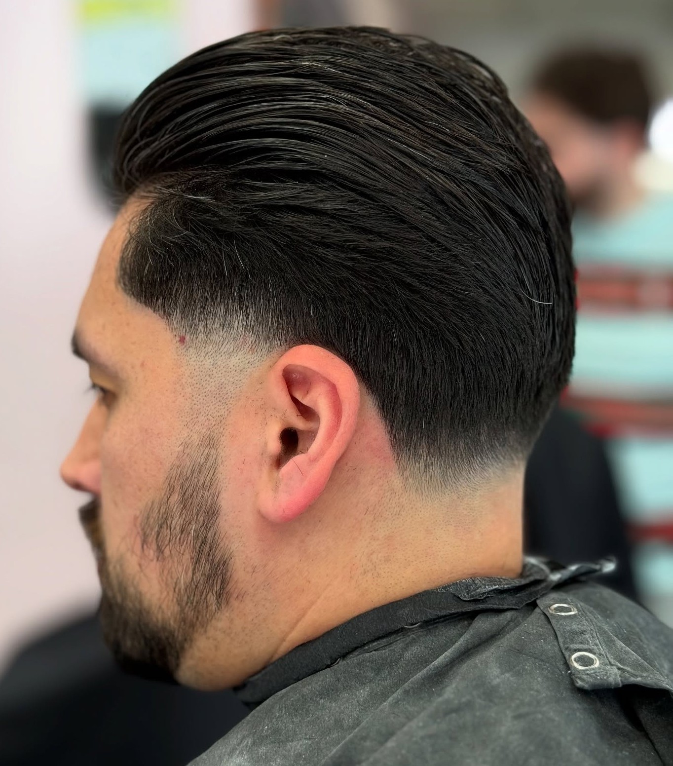 The slick back with a fade is like a contemporary twist on a timeless classic. The versatility of fade allows you to go from mid-taper haircut to skin fade, so you can effortlessly adjust the length of the sides.