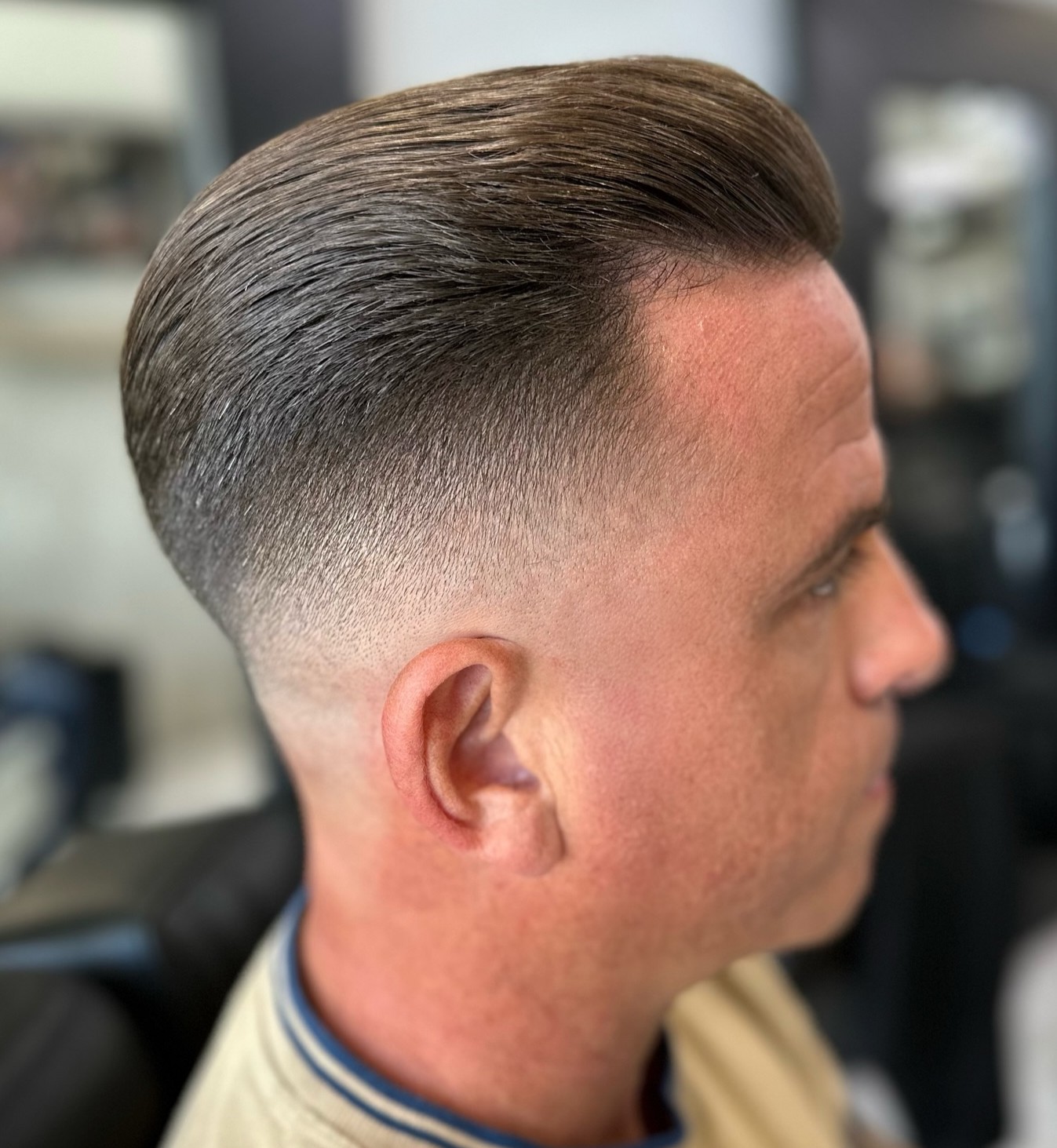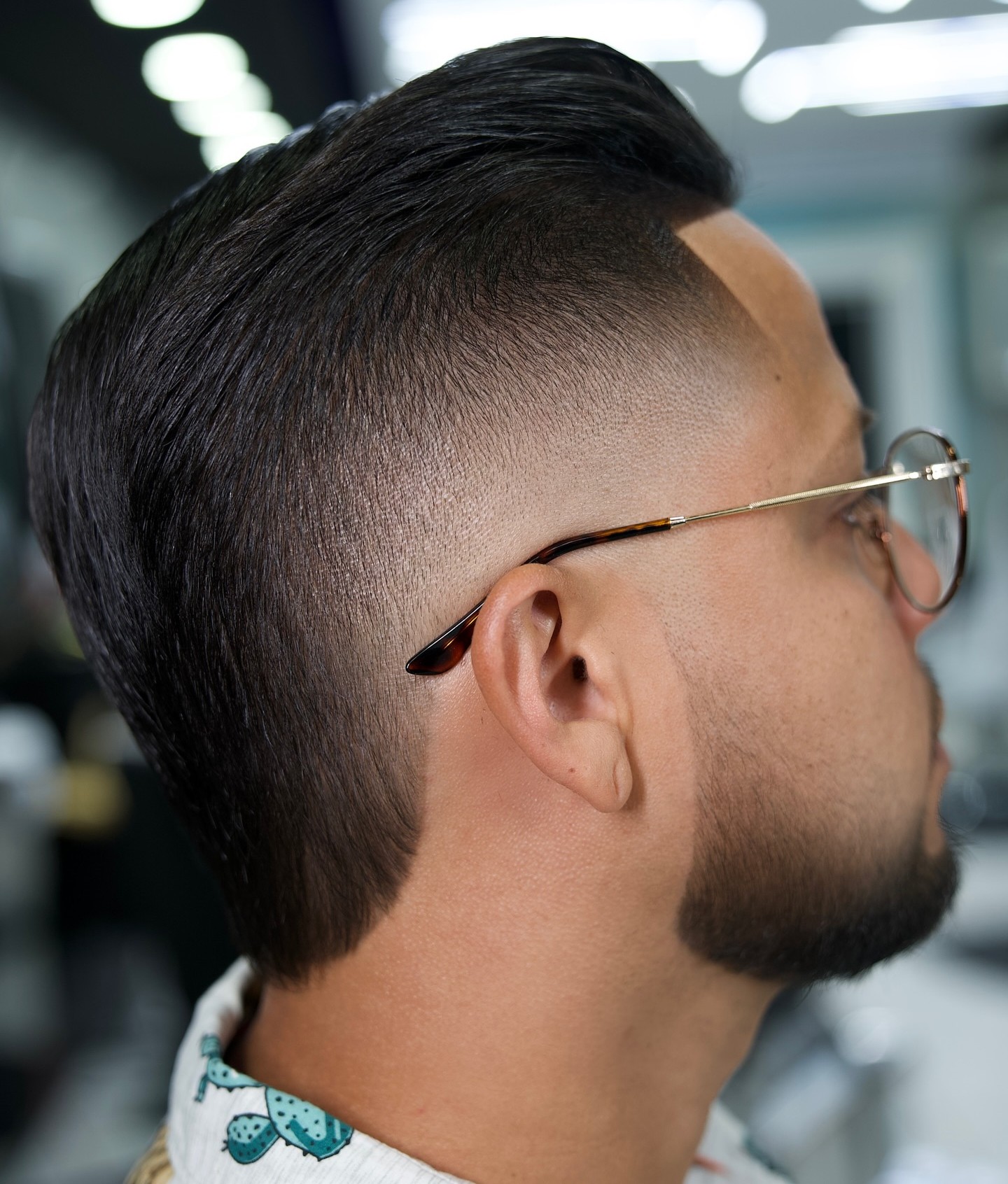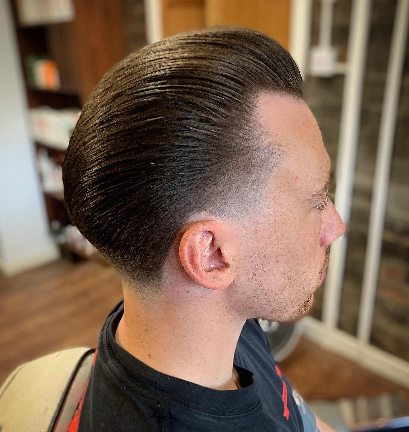 The slick back with a fade is like a contemporary twist on a timeless classic. The versatility of fade allows you to go from mid-taper haircut to skin fade, so you can effortlessly adjust the length of the sides.