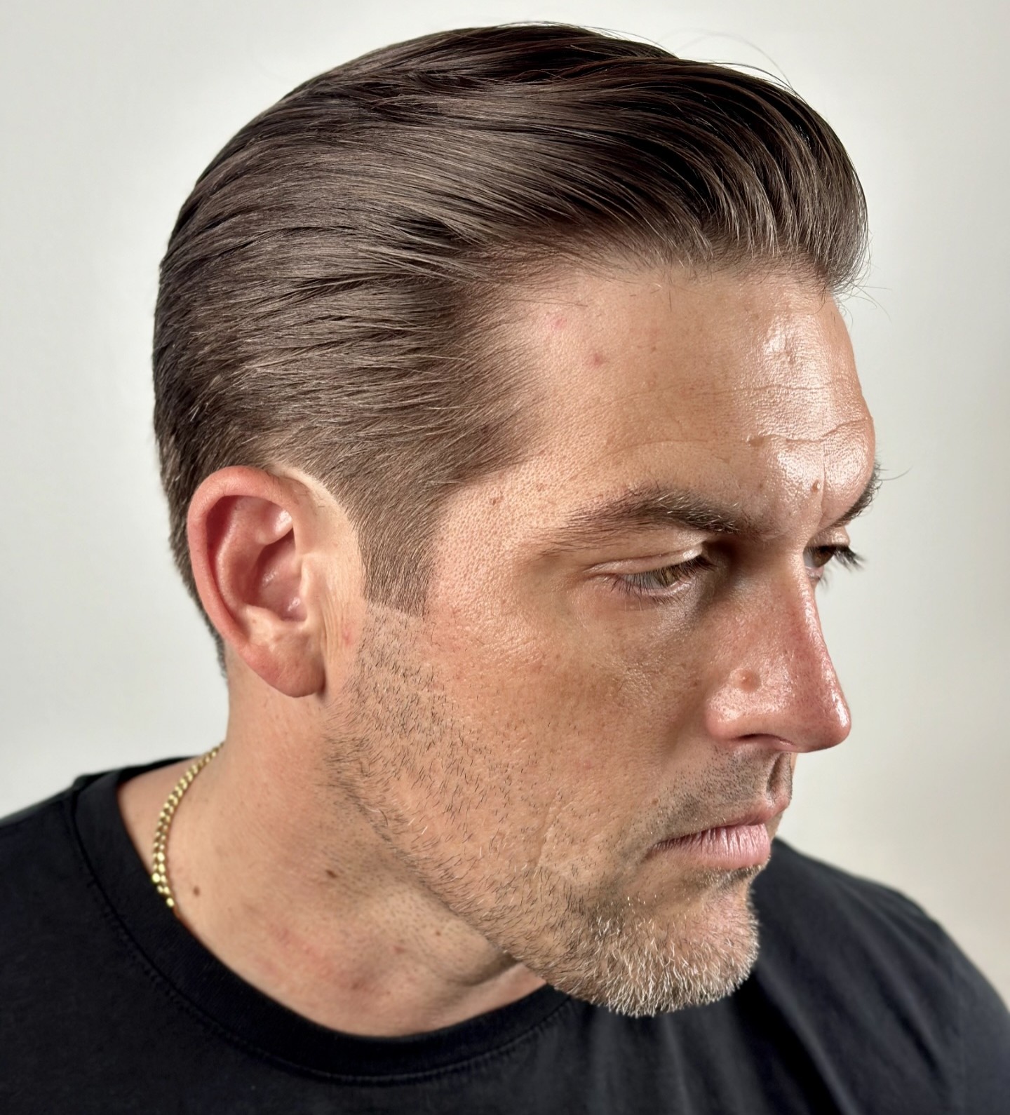 Opting for a taper instead of a fade keeps your slick back cleaner and less extreme. Complement the look with an accurate beard that embraces your masculinity.