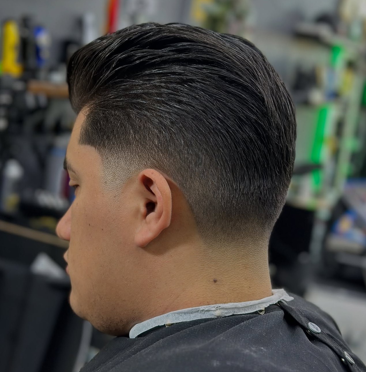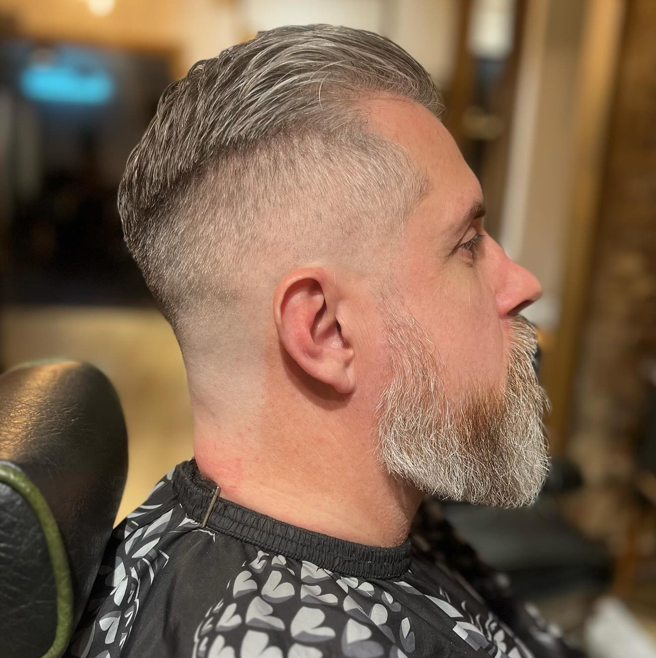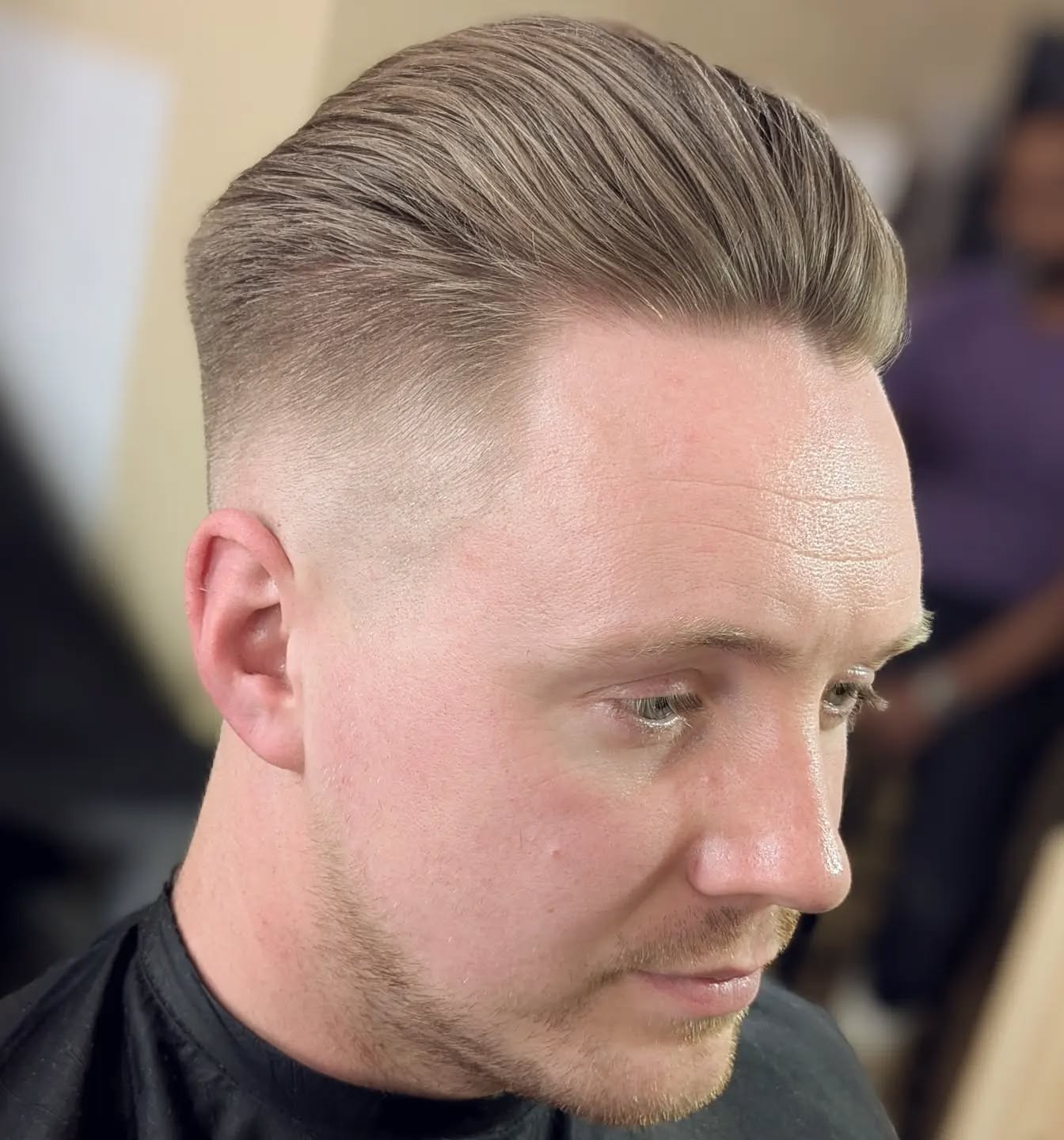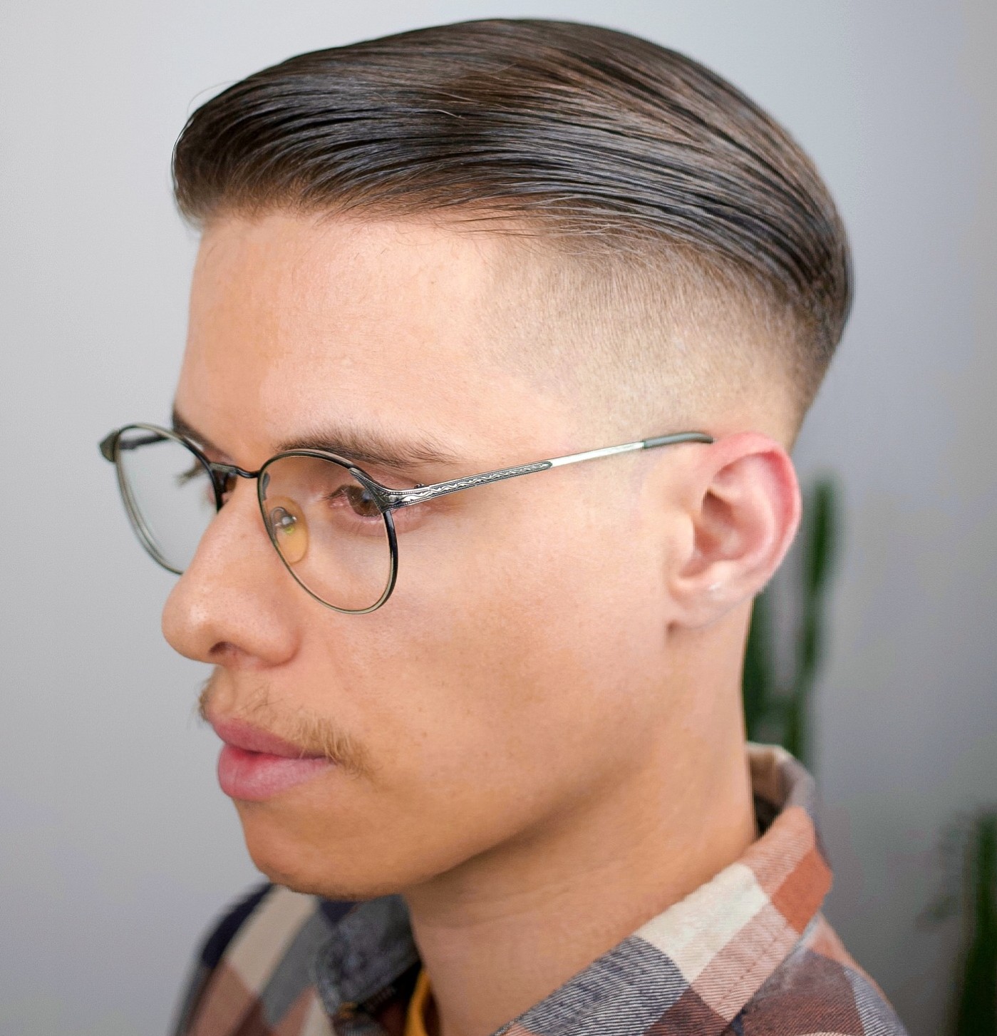 The slick back with a fade is like a contemporary twist on a timeless classic. The versatility of fade allows you to go from mid-taper haircut to skin fade, so you can effortlessly adjust the length of the sides.