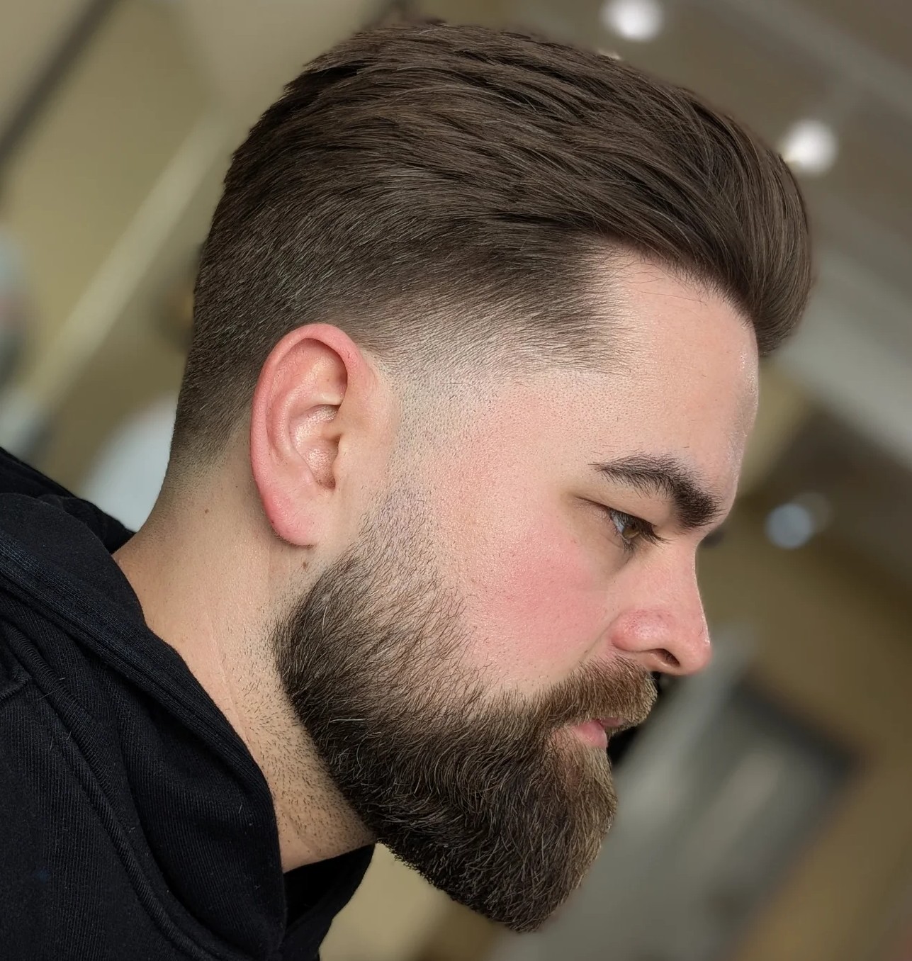 This disconnected cut with a beard is one of the most popular men’s styles of the moment because it is all about contrasts and balance. The scruffy beard and bald fade is edgy, but the combed back crown is chic and dapper.