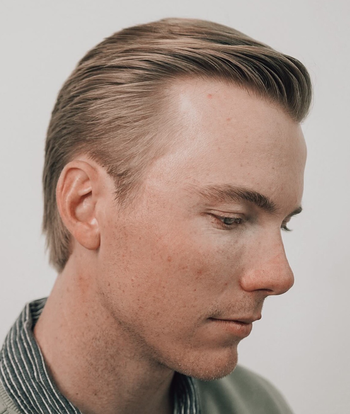 Wet-looking hair is all the rage because it requires minimal effort that yields maximum impact. A voluminous wavy top paired with temple fade creates a modern and alluring hairstyle that best suits younger men admiring classic hairstyles.