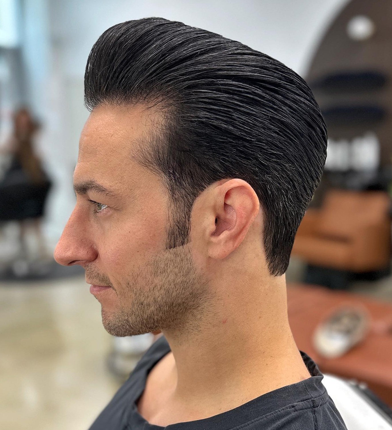Opting for a taper instead of a fade keeps your slick back cleaner and less extreme. Complement the look with an accurate beard that embraces your masculinity.