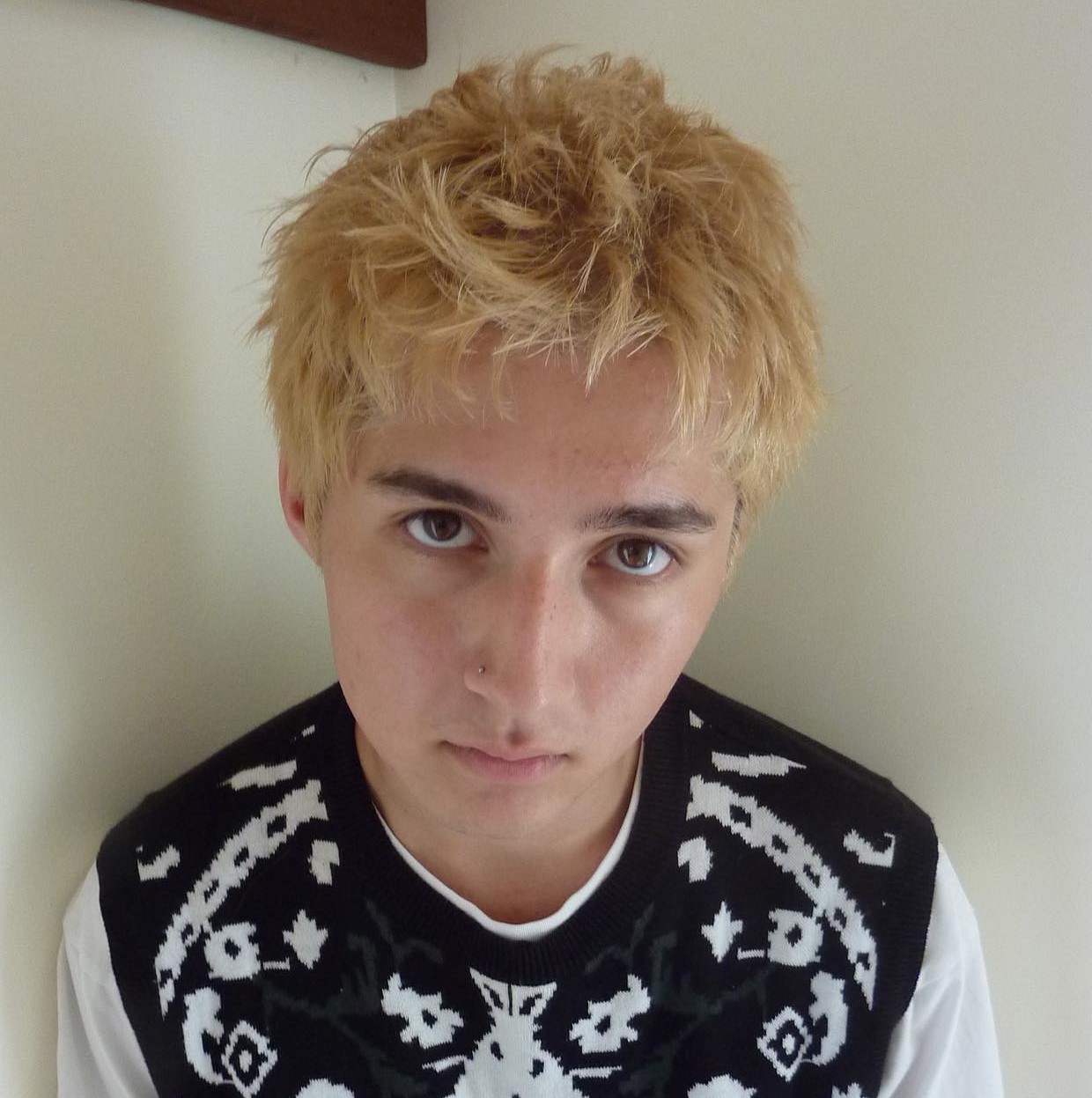 Dyed blonde hair on a man with dark facial hair is sexy. Make the contrast stand out by embracing the latest trick in the spiky hair trend – the very front of the hair combed straight up. The color gives dimension to this modern style.