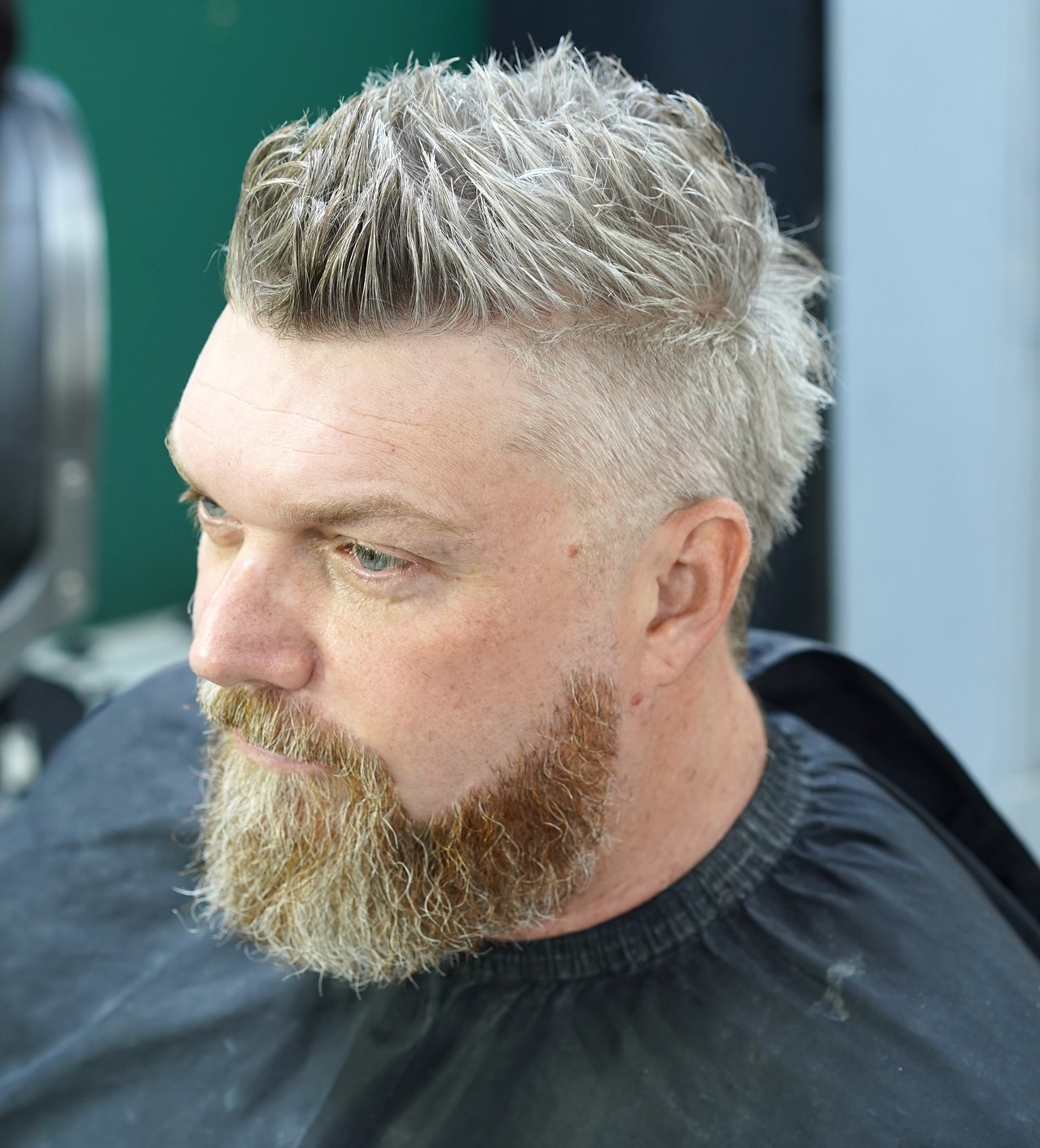 Dyed blonde hair on a man with dark facial hair is sexy. Make the contrast stand out by embracing the latest trick in the spiky hair trend – the very front of the hair combed straight up. The color gives dimension to this modern style.