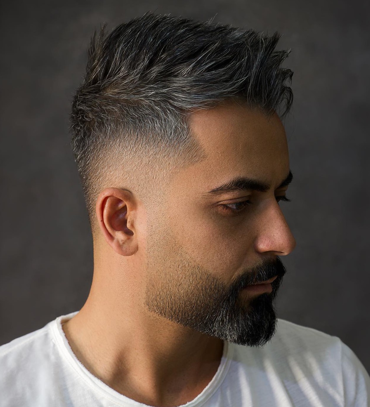 This is one well-groomed, stylish male look. The combination of the trimmed beard and mustache, thick eyebrows, shaved sides, and spiked hair is something to stop and admire. With some workable styling clay, his dark hair is styled into a perfectly imperfect texture – 100% envious style, indeed!