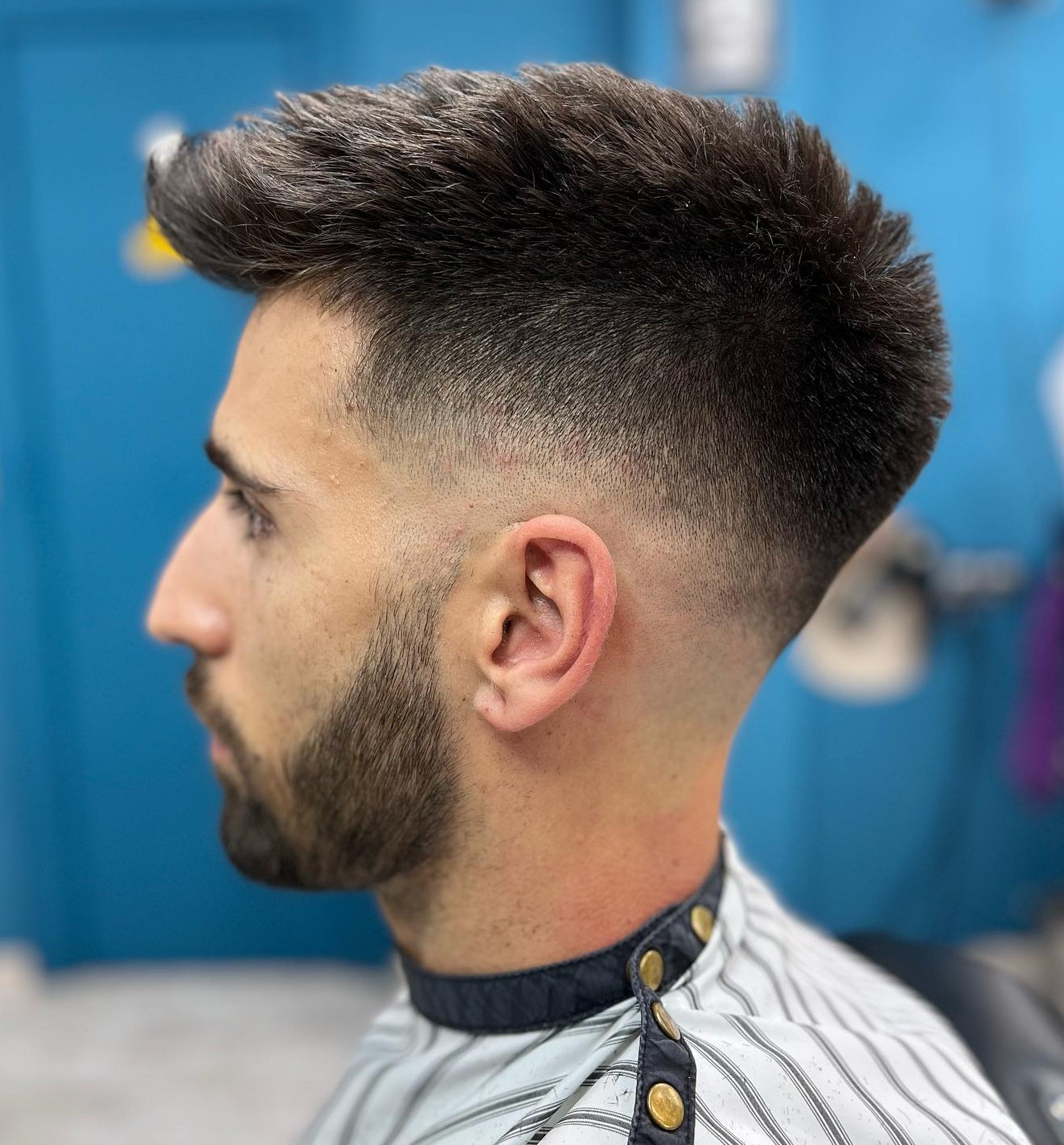 This style is for those who have hair and know the latest ways to wear it! With a medium length on the sides, burst fade around the ears and longer top, pushing forward to the upward flip, one must have patience and dedication with this style. But the results speak for themselves.