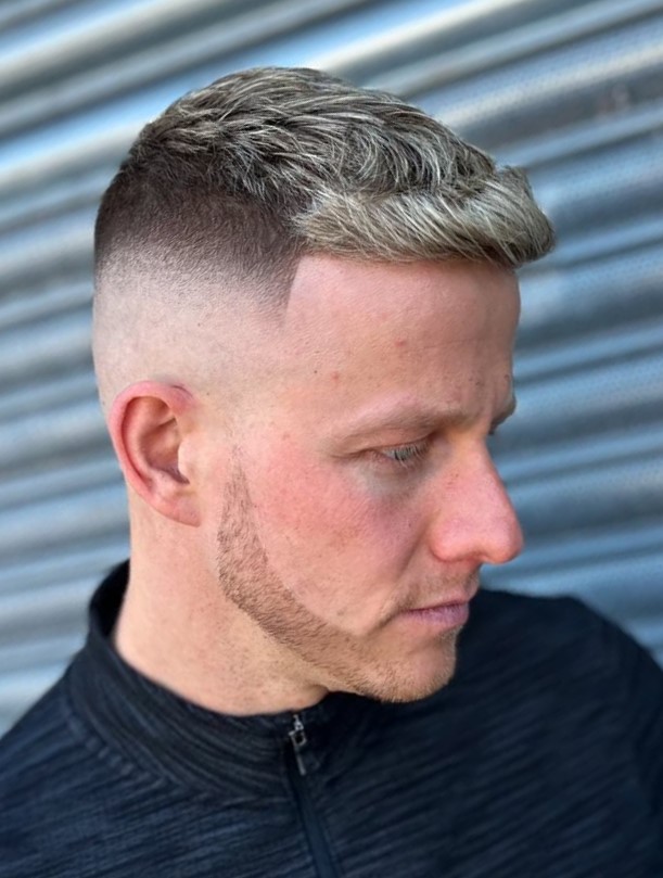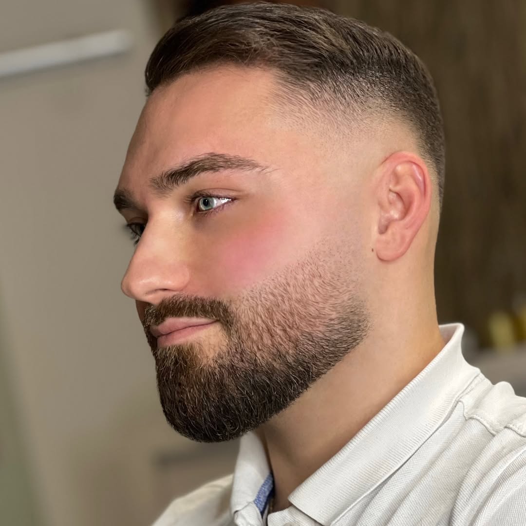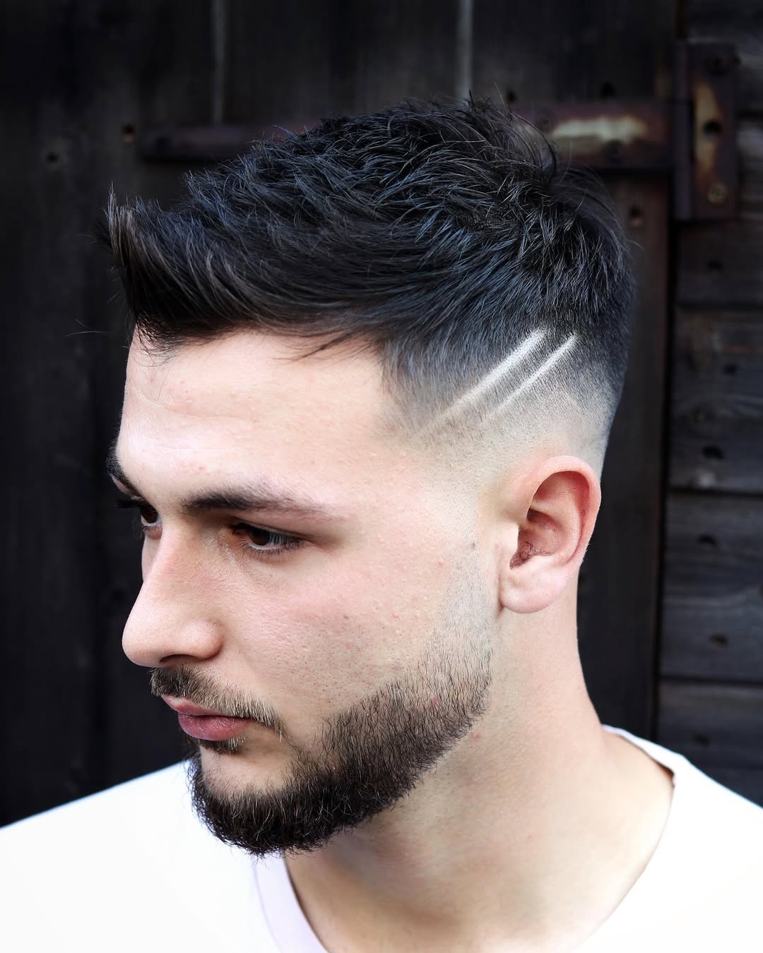 This style is a blend of undercut and fade, upgraded with a shaved part and facial hairstyle. To maintain the style, you shouldn’t wear the upper part too long, and always comb it back and to the side (revealing the defined part line).