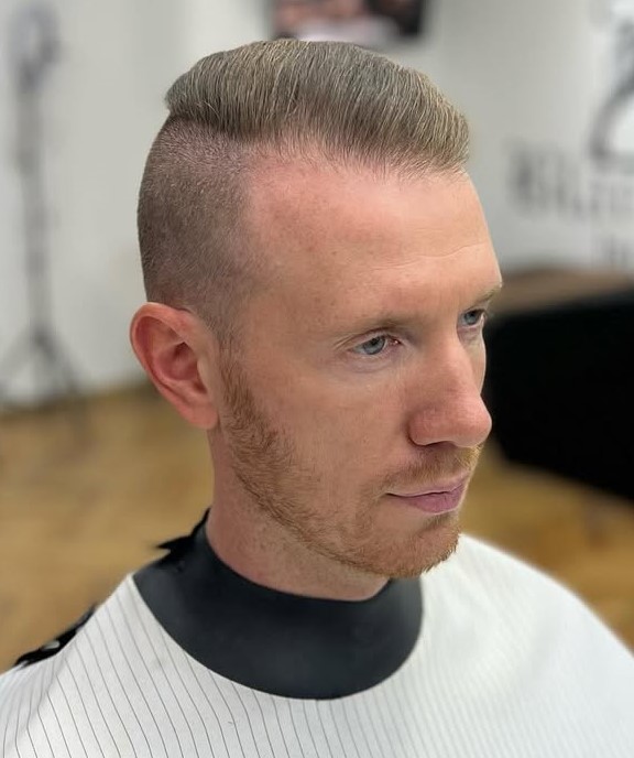 This style is a blend of undercut and fade, upgraded with a shaved part and facial hairstyle. To maintain the style, you shouldn’t wear the upper part too long, and always comb it back and to the side (revealing the defined part line).
