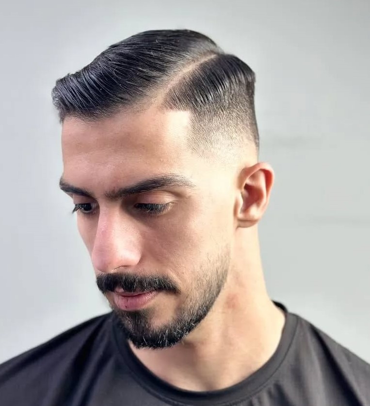 This style is a blend of undercut and fade, upgraded with a shaved part and facial hairstyle. To maintain the style, you shouldn’t wear the upper part too long, and always comb it back and to the side (revealing the defined part line).