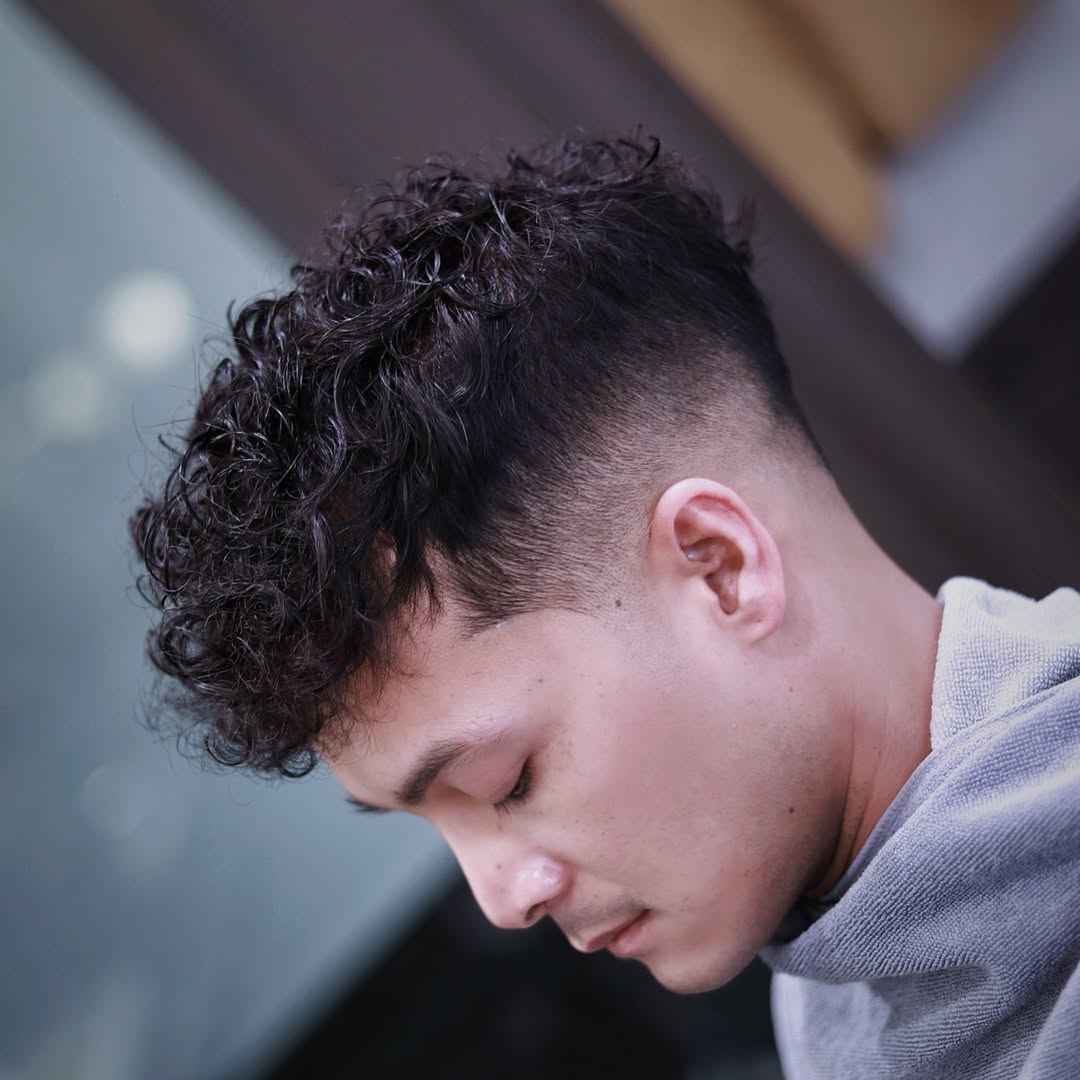 This curly undercut combines a mid taper fade and clean shaven periphery with a free-form afro style top. Add bespoke detailing with a crisp stripe etched into the front hairline. The blended and precise cut requires virtually no styling, simply wash and go!