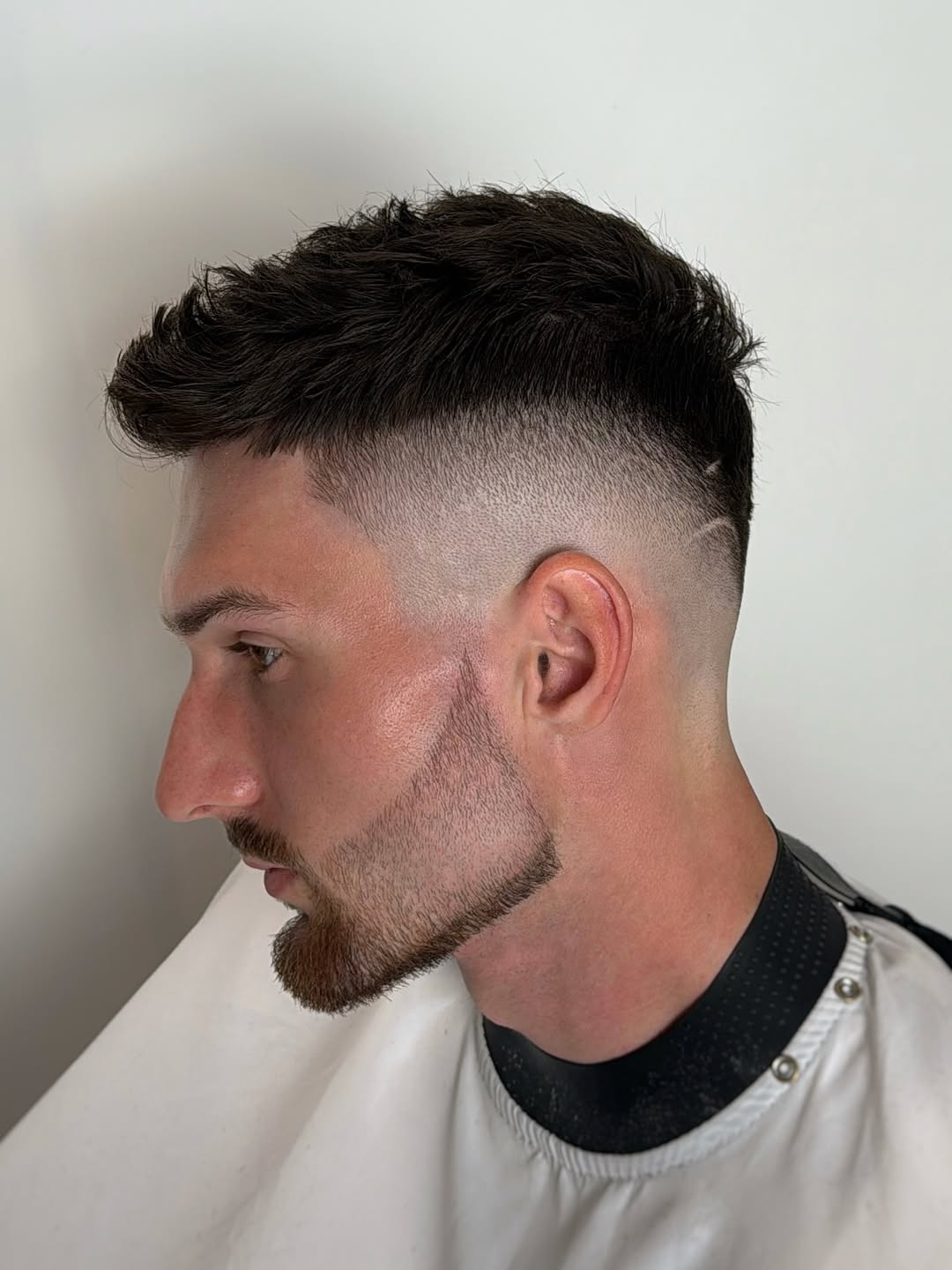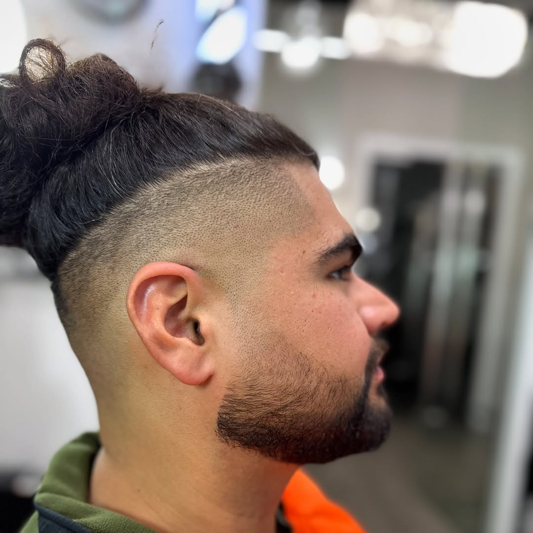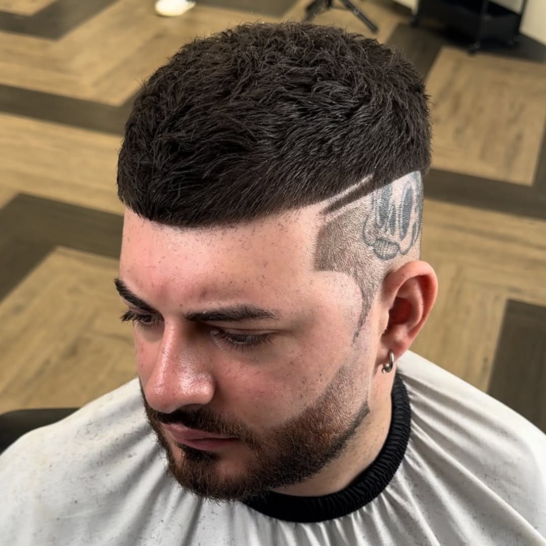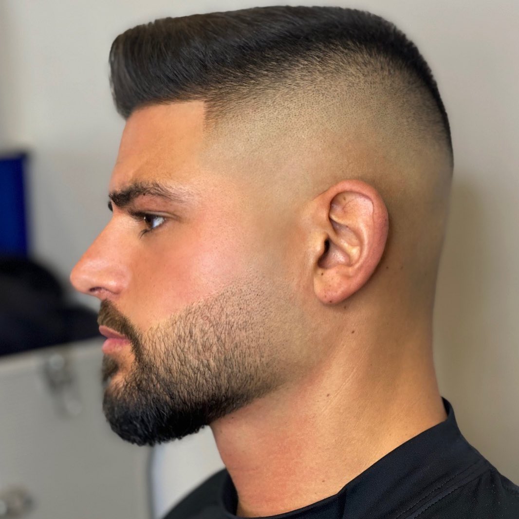 This style is a blend of undercut and fade, upgraded with a shaved part and facial hairstyle. To maintain the style, you shouldn’t wear the upper part too long, and always comb it back and to the side (revealing the defined part line).