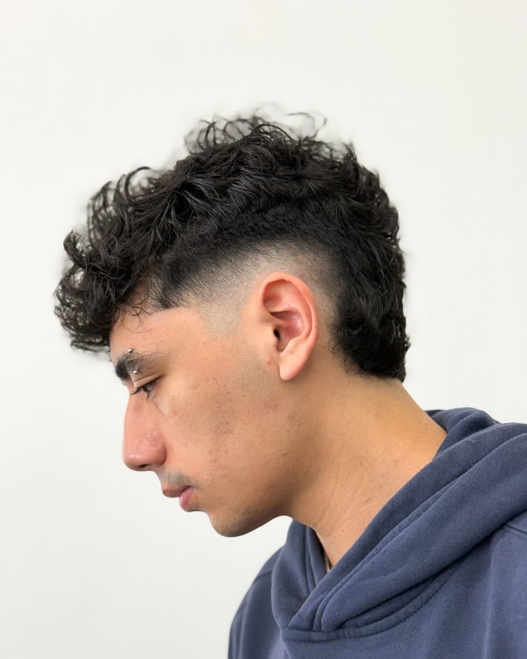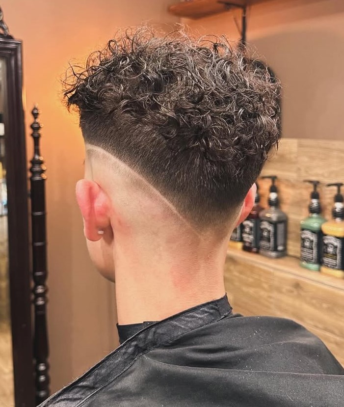 This curly undercut combines a mid taper fade and clean shaven periphery with a free-form afro style top. Add bespoke detailing with a crisp stripe etched into the front hairline. The blended and precise cut requires virtually no styling, simply wash and go!