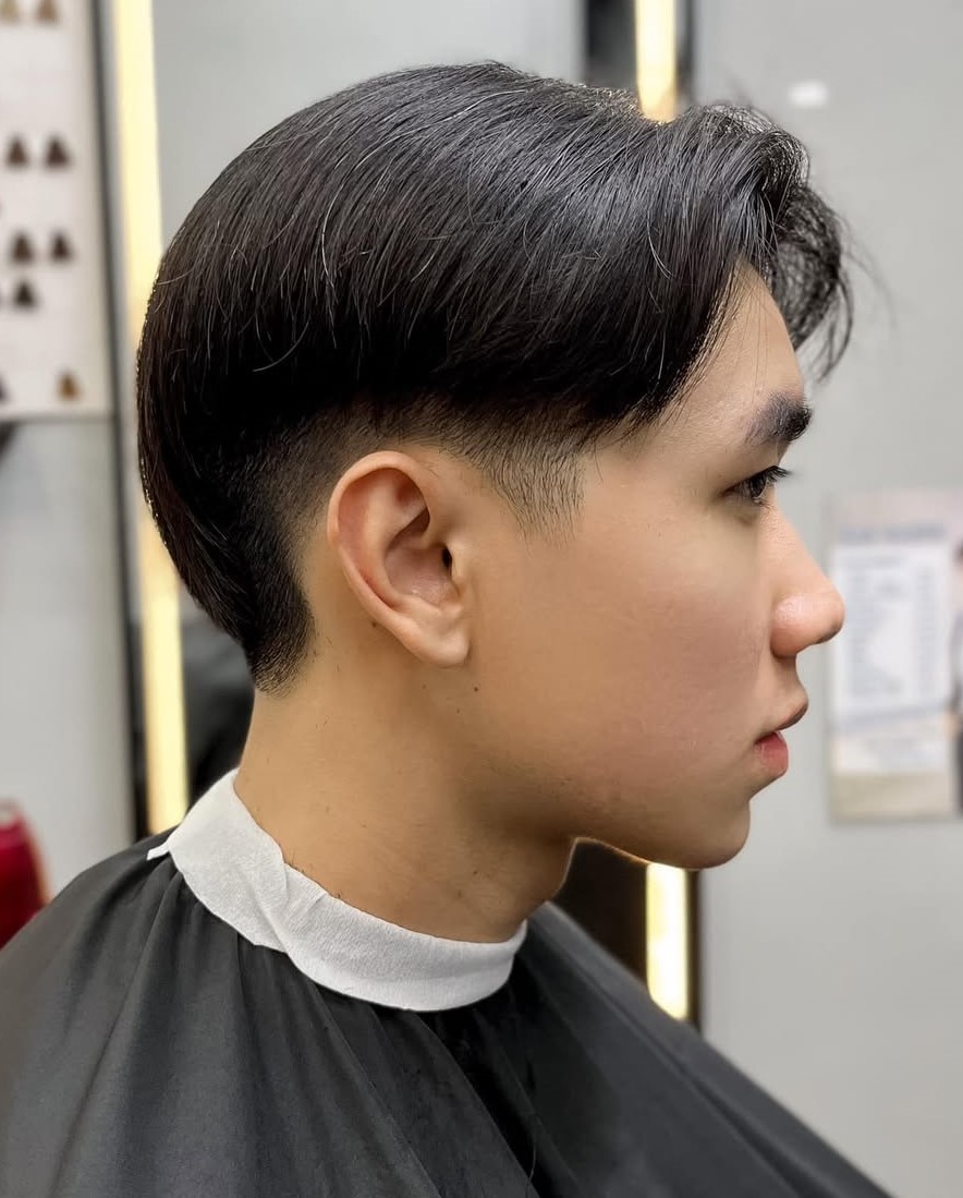 This hairstyle is evenly short on one side with a uniformly layered top. Use a hairdryer to sculpt up and in, creating a polished silhouette. Some men shy away from heat styling, viewing it as feminine, but there’s no better way to achieve this smooth volume.