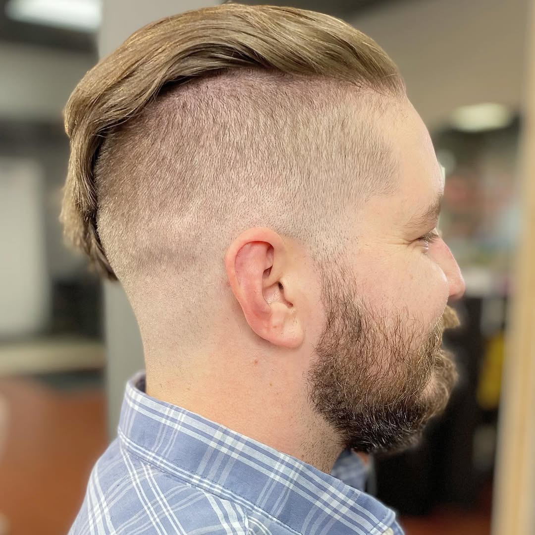 This style is a blend of undercut and fade, upgraded with a shaved part and facial hairstyle. To maintain the style, you shouldn’t wear the upper part too long, and always comb it back and to the side (revealing the defined part line).