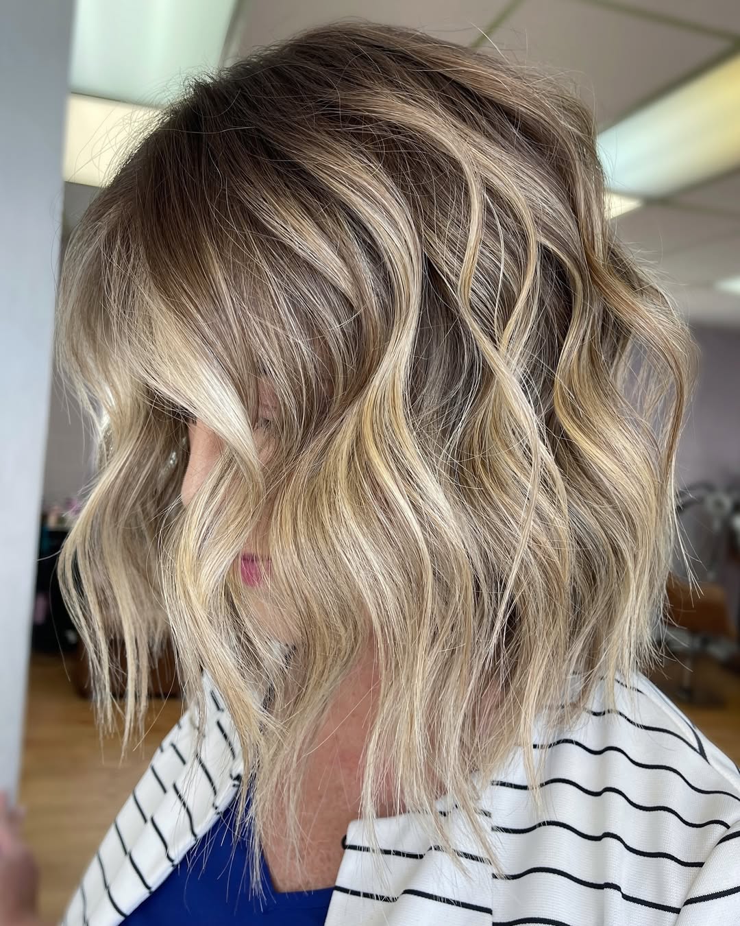 Consider an inverted, angled shape to bring out the best of your beachy texture. The dark roots add depth and volume to the different shades of blonde, and the long, bright white pieces in the front highlight the face. Part it on the side to show off all the layers and texture.
