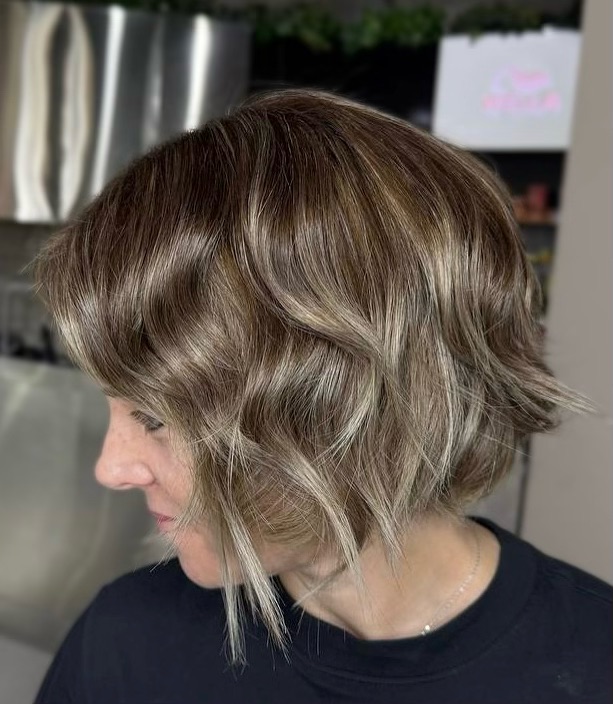 The soft undone curls in this short choppy bob create a youthful and appealing look. The ashy brown angled style is fresh and easy, with a sense of fullness and volume. It’s an excellent choice for the woman whose hair tends to be thin or a little flat at times.