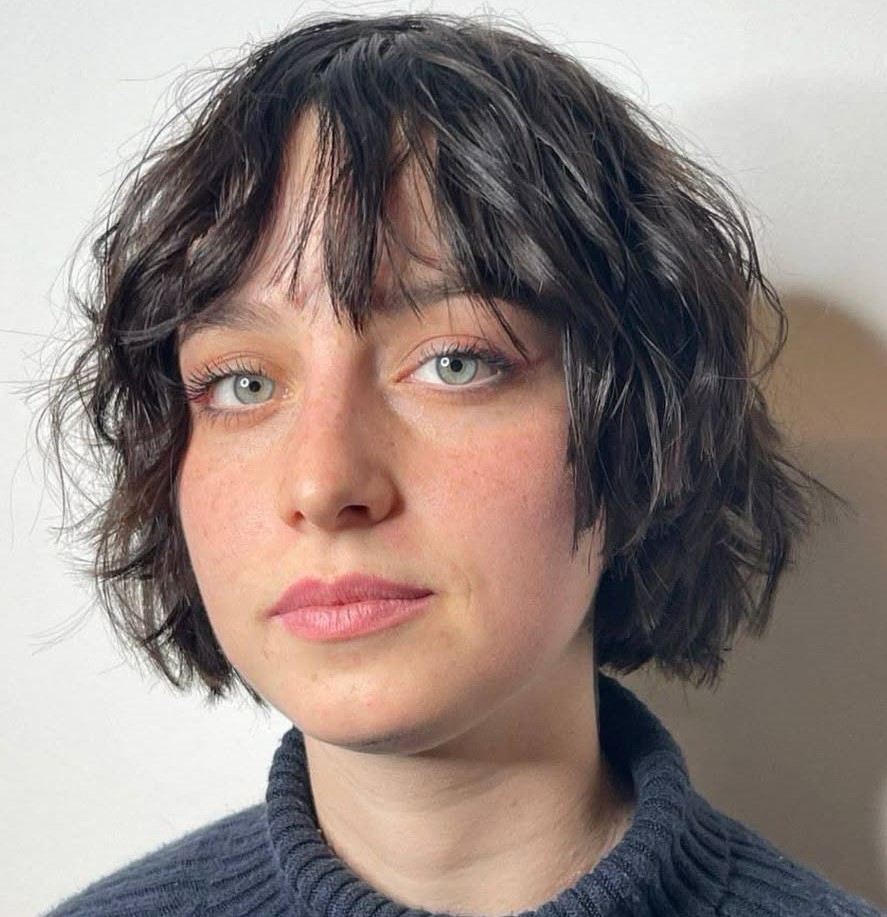 While having a curly style with straight bangs used to be a faux pas, it can work with shorter looks because it helps to blend different layers. Straight pieces in the front frame the face and work especially well to slim chubby cheeks.