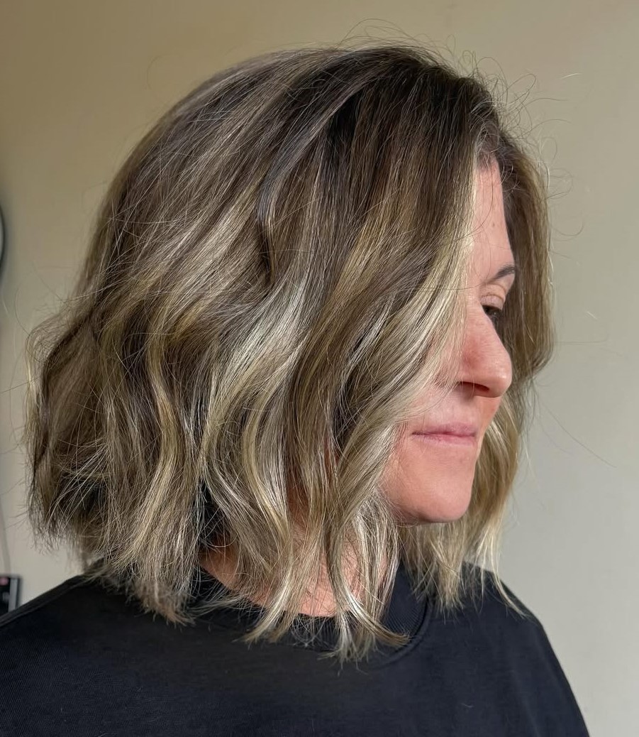 If you’re feeling youthful and looking for a super-fashionable and comfy hairdo, a textured shoulder-length lob might be the most flattering way to go. Try a mixture of subtle cool- and warm-toned highlights for a more modern, visually interesting style.