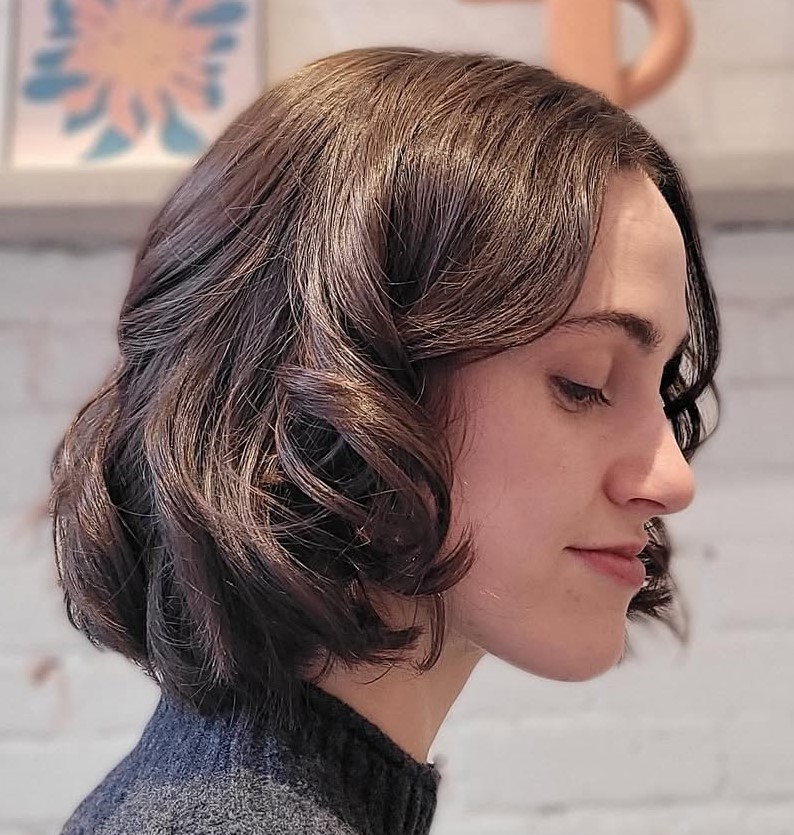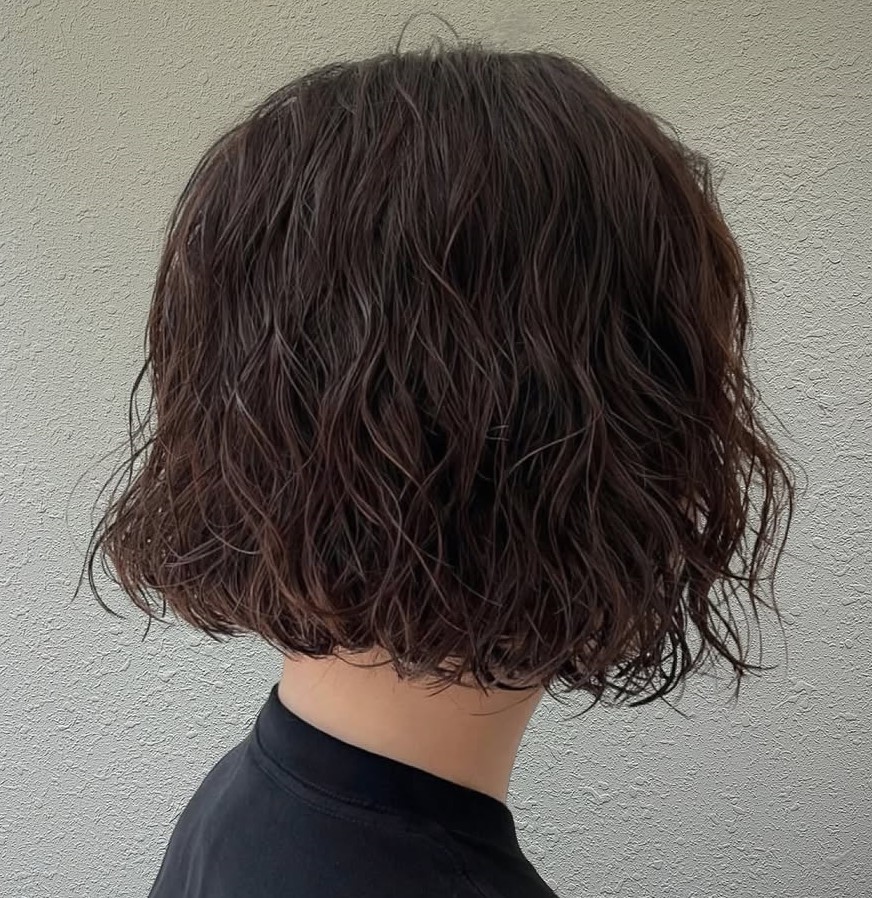 Cute and feminine, tighter curls give this chin-length style more movement and volume. It’s an excellent way to make your hair look fuller and livelier. Apply a thermal protection spray onto your damp hair before styling to maintain its healthy appearance.
