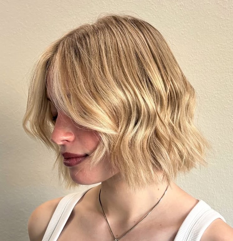 If you have thin hair, a blunt haircut would work wonders for your hair type. It creates a thicker hair effect and your ends don’t look thin anymore. This blonde wavy bob hairstyle is super low-maintenance, too. If you are rocking naturally textured hair, just let it air dry and apply a texturizing spray to achieve that carefree vibe.