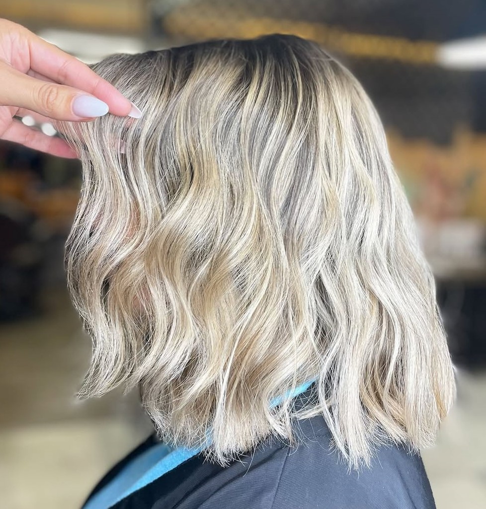 Consider an inverted, angled shape to bring out the best of your beachy texture. The dark roots add depth and volume to the different shades of blonde, and the long, bright white pieces in the front highlight the face. Part it on the side to show off all the layers and texture.