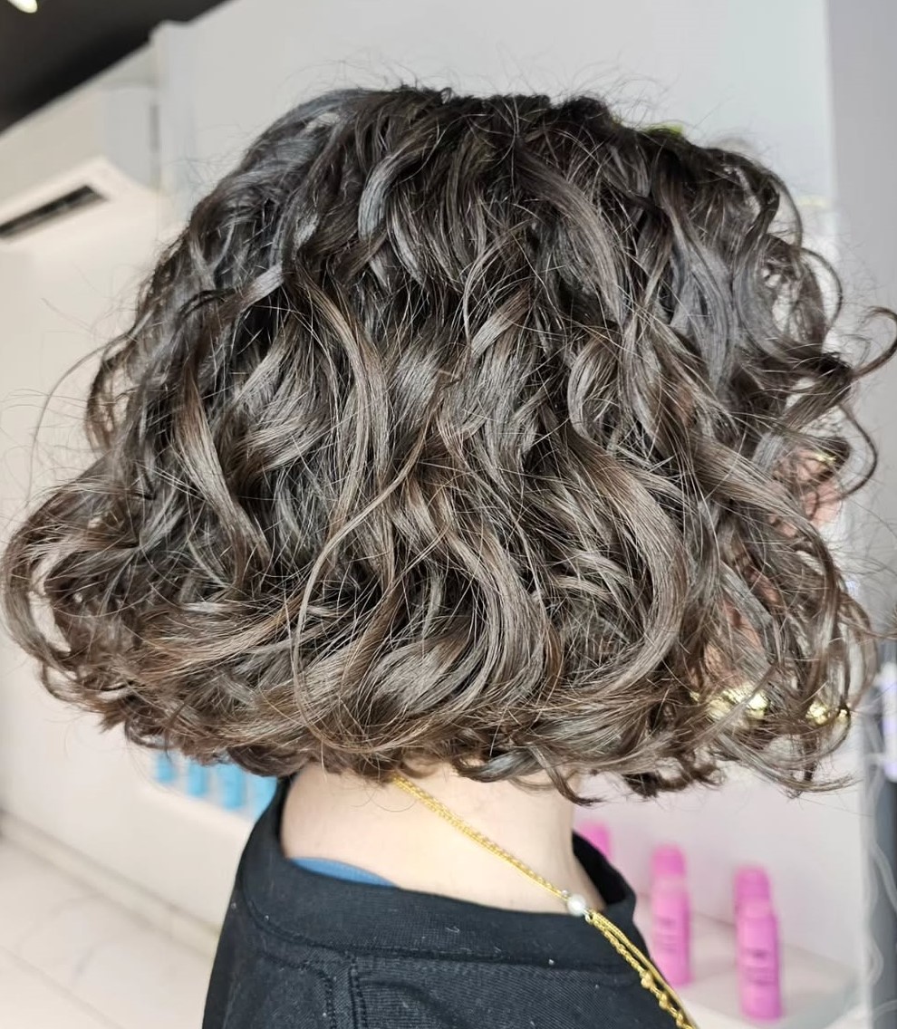 Cute and feminine, tighter curls give this chin-length style more movement and volume. It’s an excellent way to make your hair look fuller and livelier. Apply a thermal protection spray onto your damp hair before styling to maintain its healthy appearance.