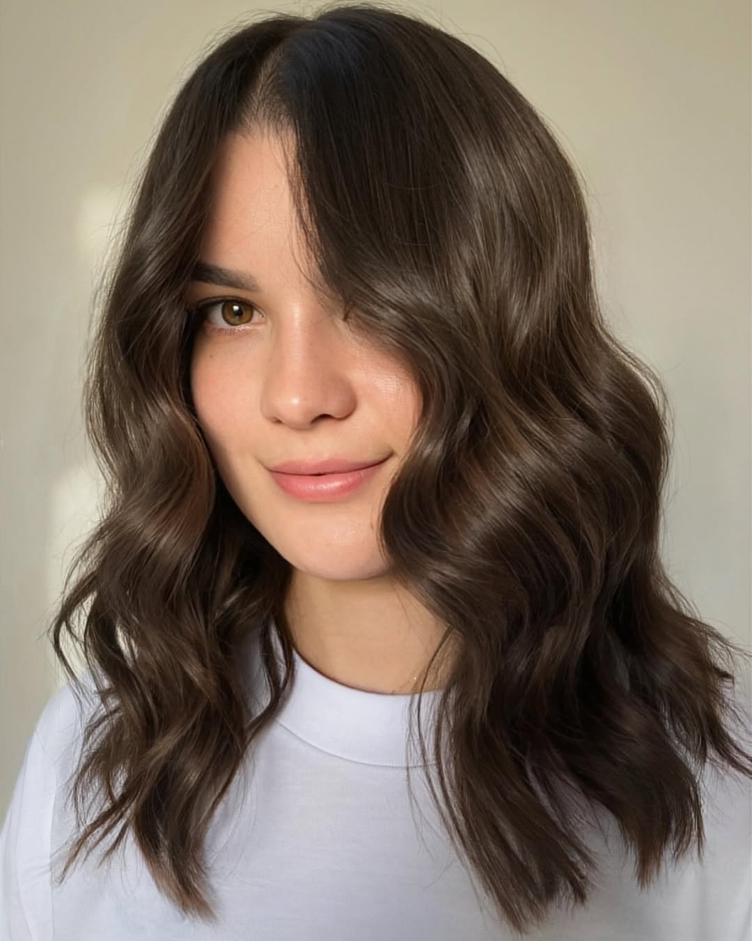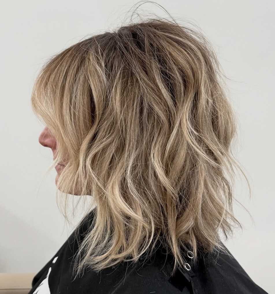 If you’re feeling youthful and looking for a super-fashionable and comfy hairdo, a textured shoulder-length lob might be the most flattering way to go. Try a mixture of subtle cool- and warm-toned highlights for a more modern, visually interesting style.