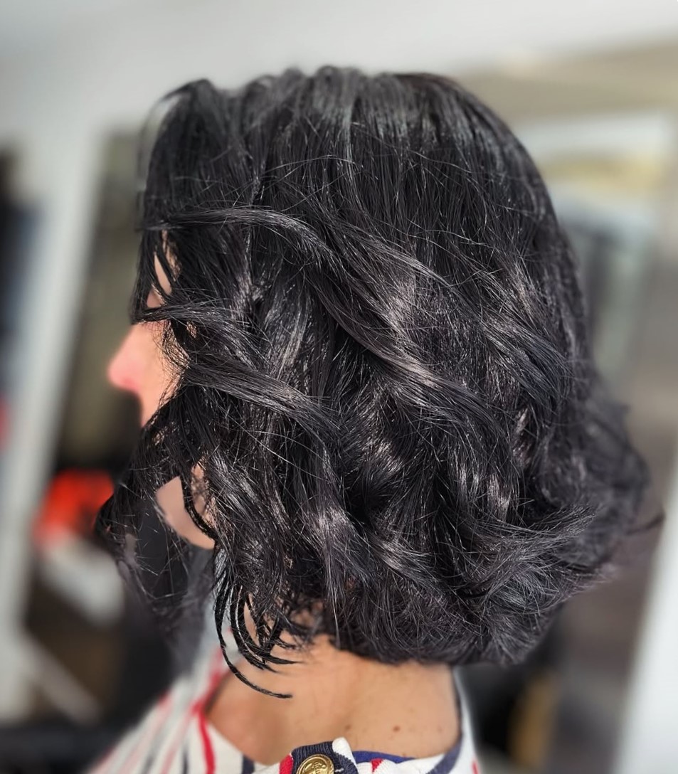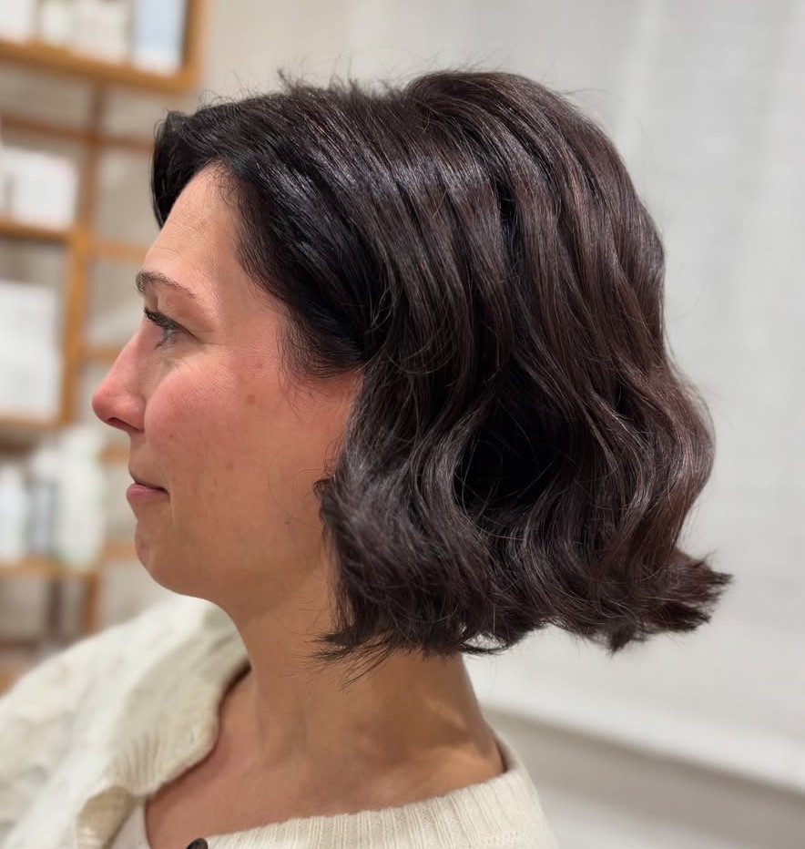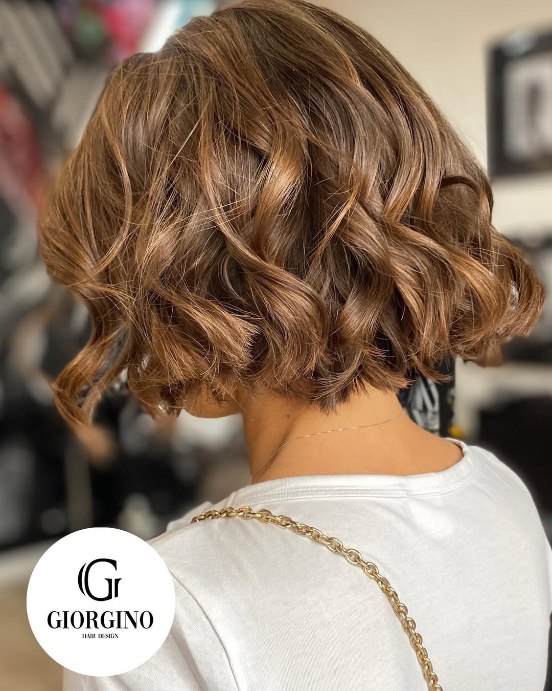 Cute and feminine, tighter curls give this chin-length style more movement and volume. It’s an excellent way to make your hair look fuller and livelier. Apply a thermal protection spray onto your damp hair before styling to maintain its healthy appearance.