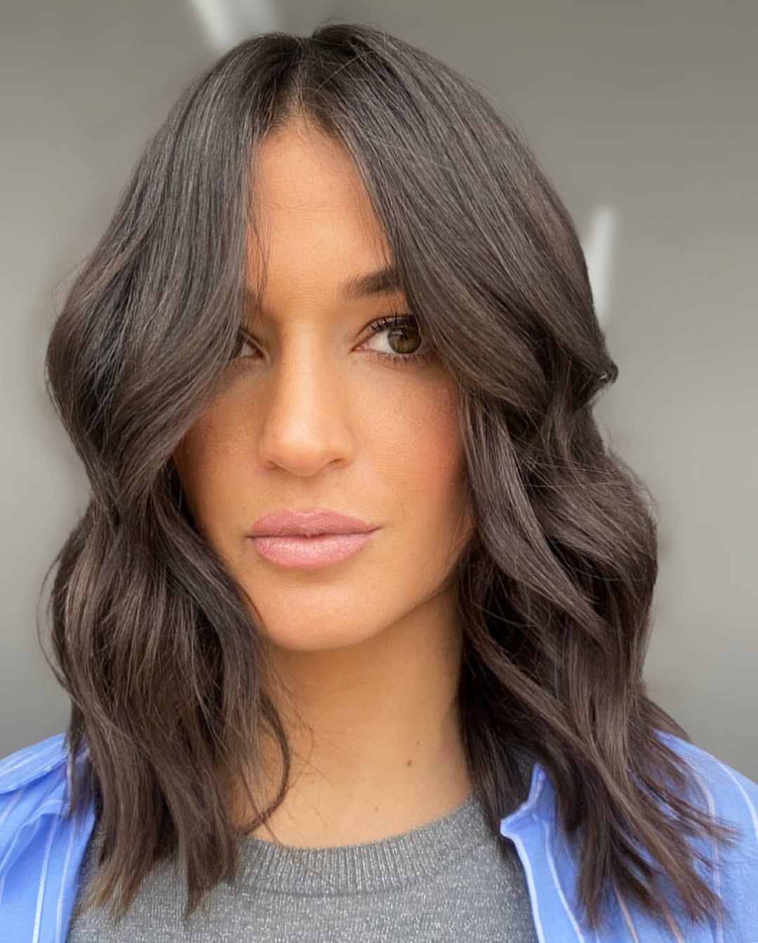 A great option for active types, the loose midshaft-to-ends curls of the tousled lob look spectacular when they flow freely and gently touch the collarbone. The dynamic spirals and the classic center part mean that it can be easily gathered in a flouncy ponytail when you’re exercising or out on a hike.