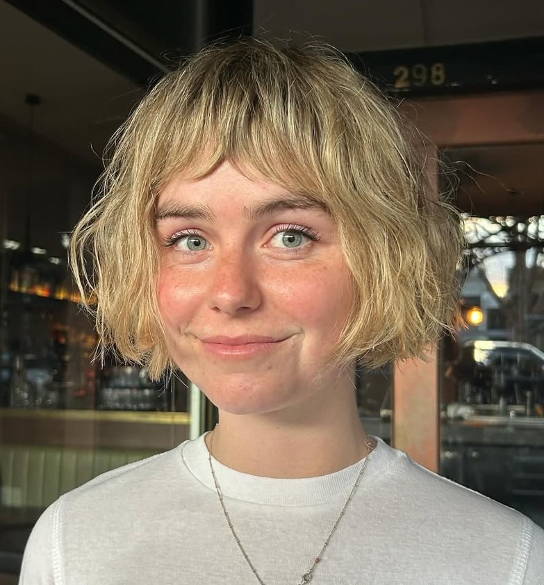 Wear your cut jaw-length and show the world your fun-loving beach-blonde locks. The razored ends and the tousled top with bangs do a wonderful job of providing lift and added texture to flat fine hair. The dark roots and blonde balayage highlights are youthful and summer-ready.