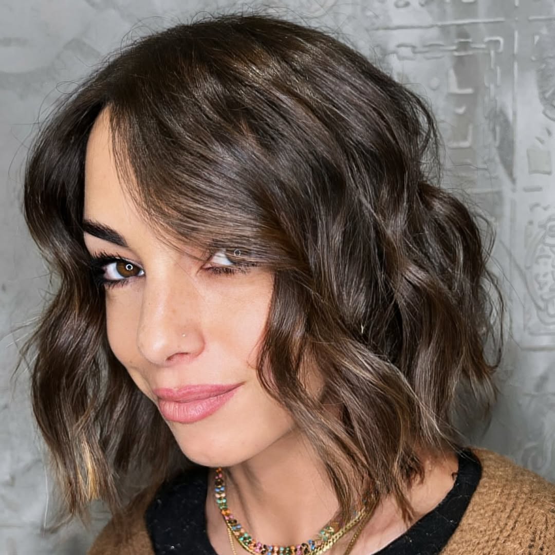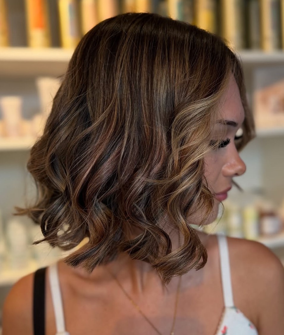 Make a wavy bob hairstyle your own with the help of some expert color that is tailored to your skin tone. This beautiful balayage pairs well with her slightly tanned complexion because the ash hues create a good contrast and won’t add any ruddiness.