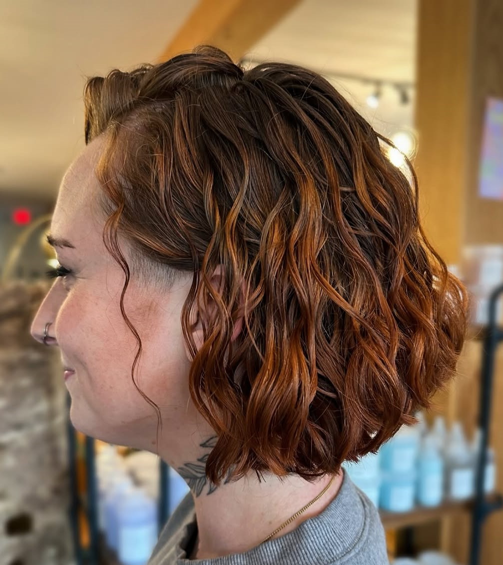 A lob lets your medium length loose curls cascade on the top of your shoulders. The bright copper blonde balayage appears naturally sun-kissed, giving your hair shiny and healthy glow. The curly tendrils are slightly lighter in the front to refresh the complexion.