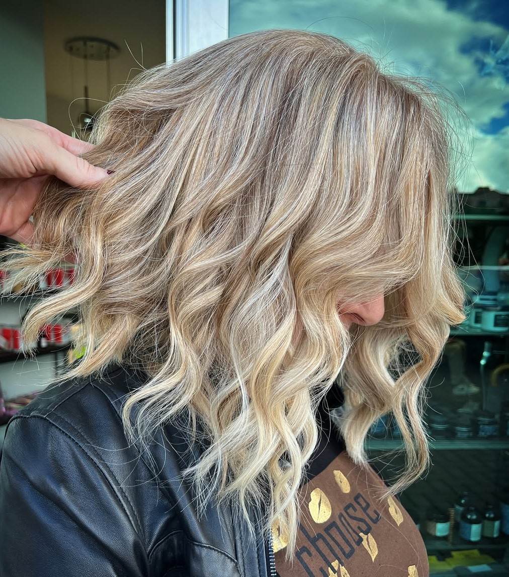 Consider an inverted, angled shape to bring out the best of your beachy texture. The dark roots add depth and volume to the different shades of blonde, and the long, bright white pieces in the front highlight the face. Part it on the side to show off all the layers and texture.