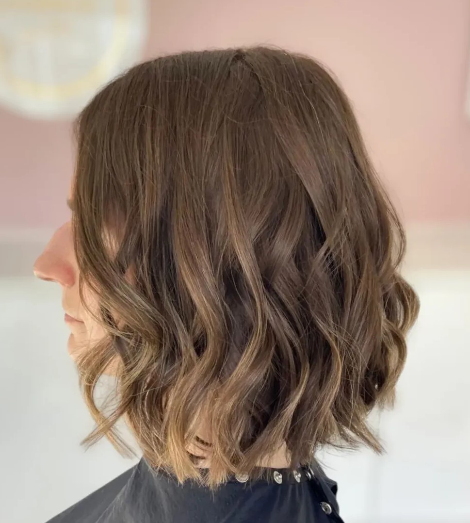 Make a wavy bob hairstyle your own with the help of some expert color that is tailored to your skin tone. This beautiful balayage pairs well with her slightly tanned complexion because the ash hues create a good contrast and won’t add any ruddiness.