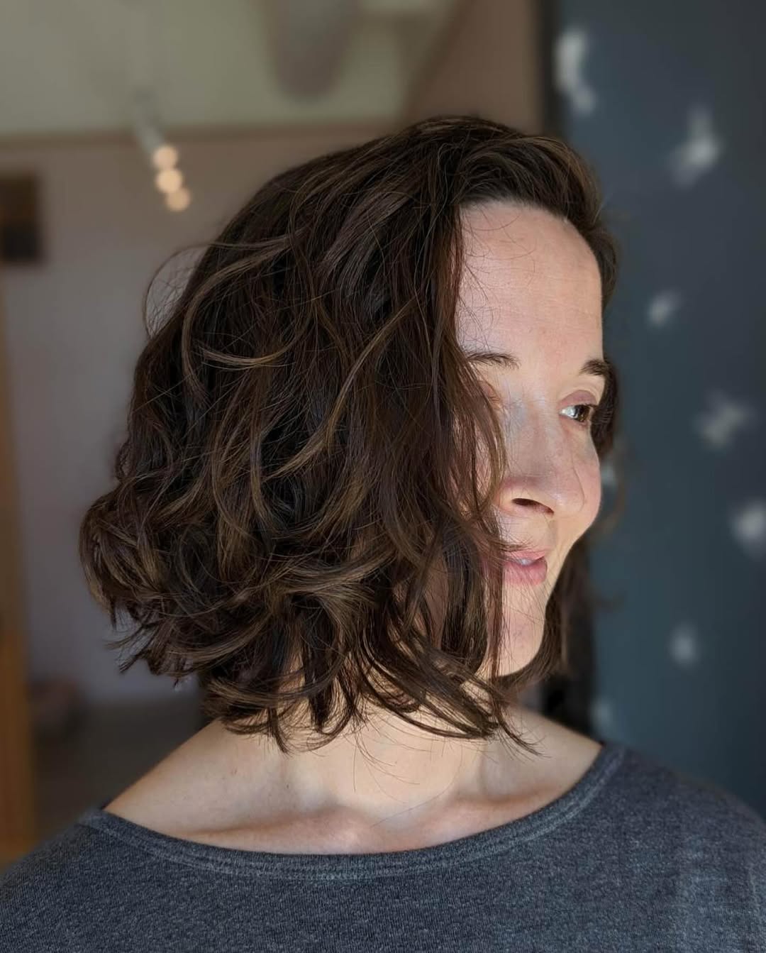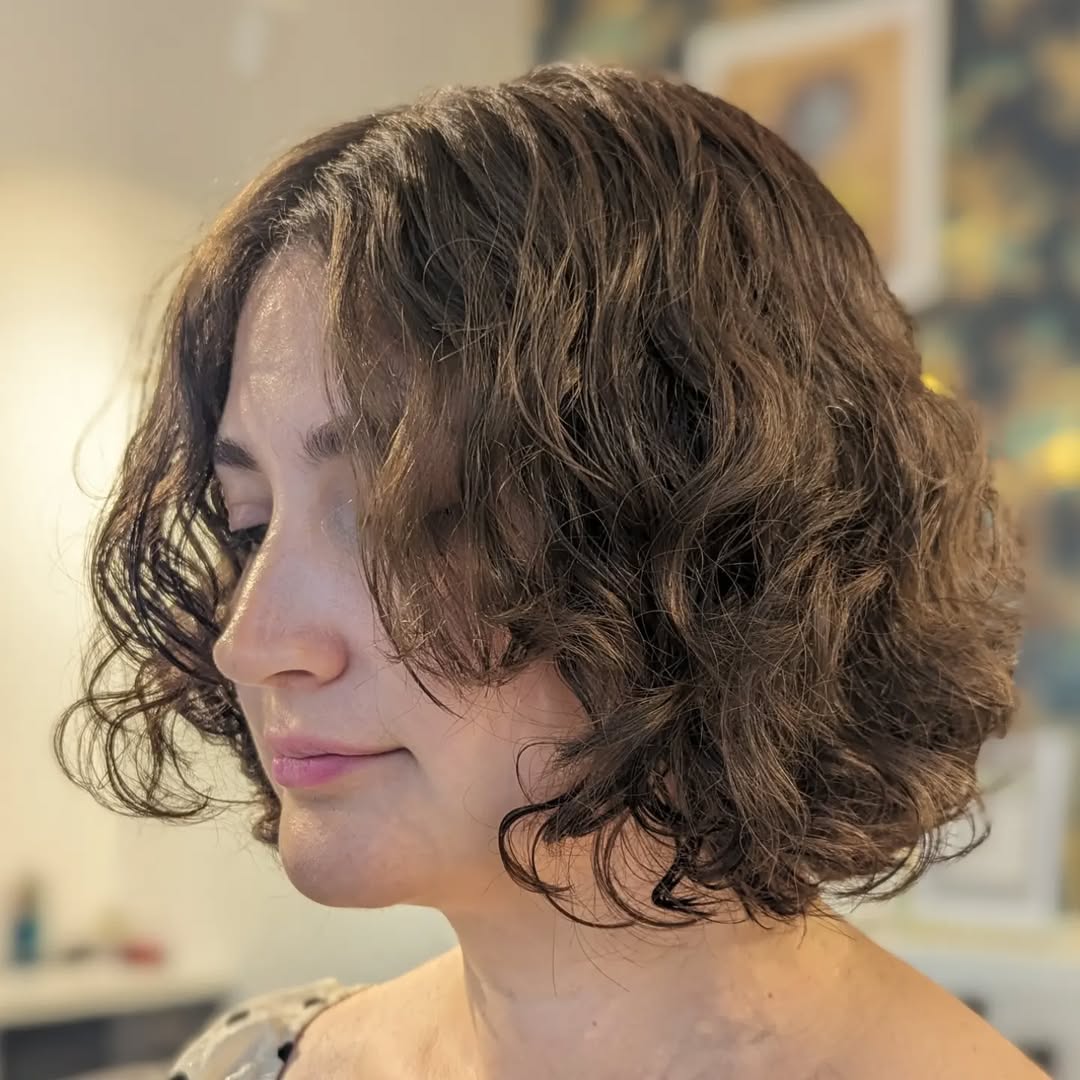 Cute and feminine, tighter curls give this chin-length style more movement and volume. It’s an excellent way to make your hair look fuller and livelier. Apply a thermal protection spray onto your damp hair before styling to maintain its healthy appearance.