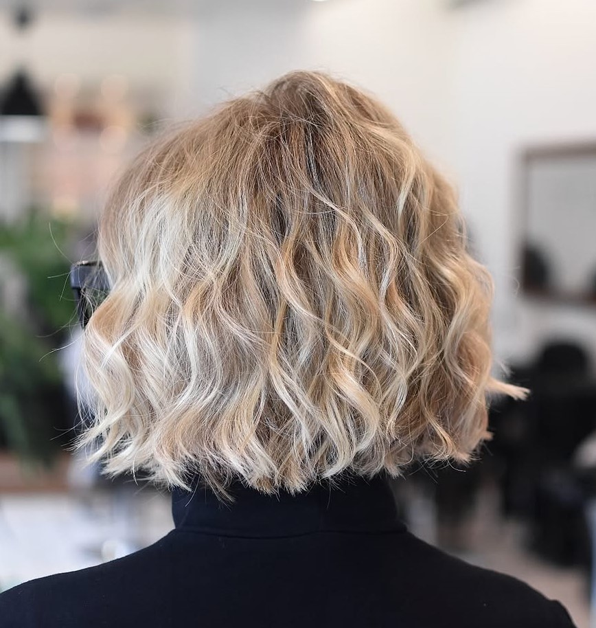 Make a wavy bob hairstyle your own with the help of some expert color that is tailored to your skin tone. This beautiful balayage pairs well with her slightly tanned complexion because the ash hues create a good contrast and won’t add any ruddiness.