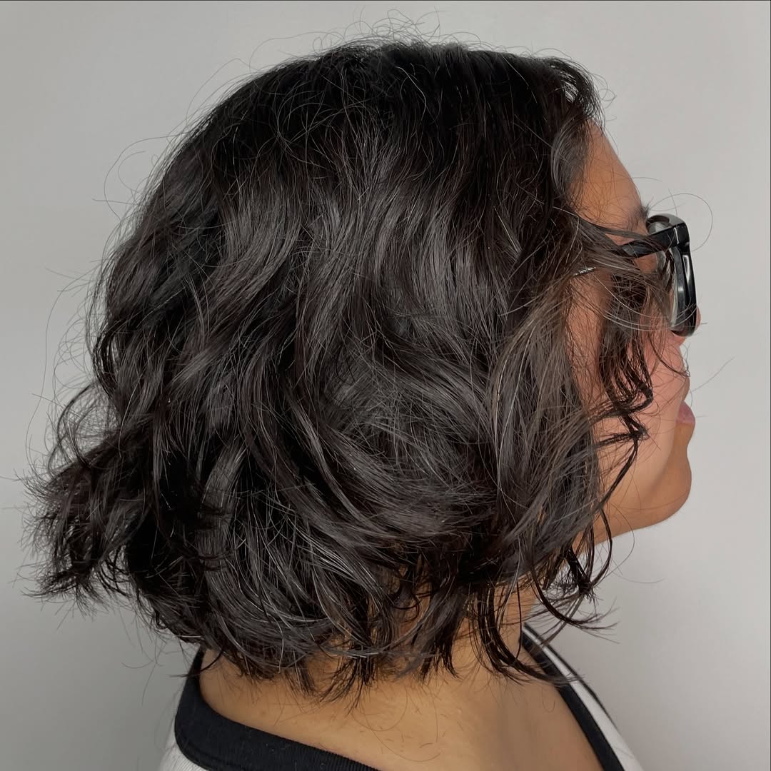 Cute and feminine, tighter curls give this chin-length style more movement and volume. It’s an excellent way to make your hair look fuller and livelier. Apply a thermal protection spray onto your damp hair before styling to maintain its healthy appearance.