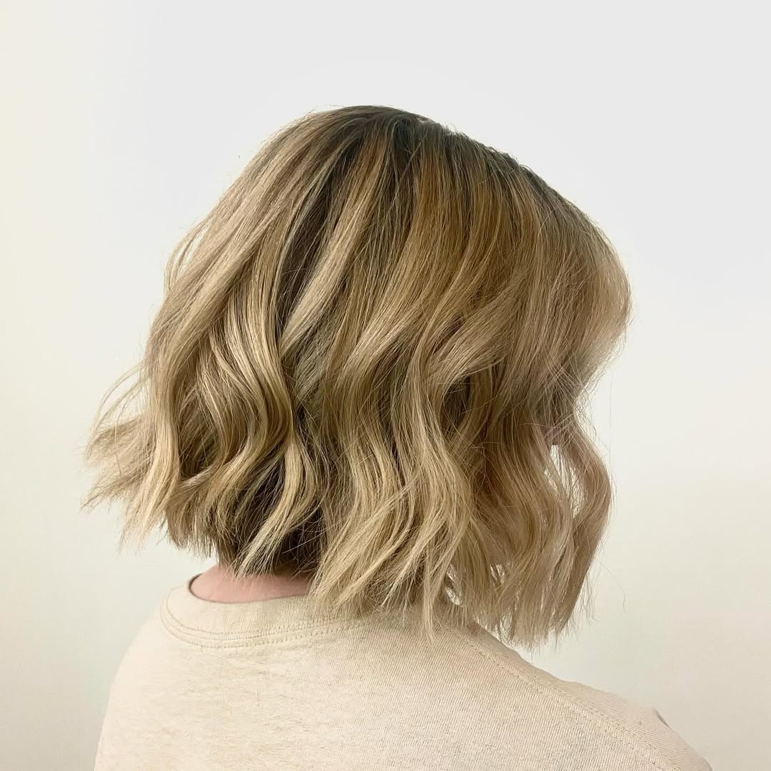 Consider an inverted, angled shape to bring out the best of your beachy texture. The dark roots add depth and volume to the different shades of blonde, and the long, bright white pieces in the front highlight the face. Part it on the side to show off all the layers and texture.