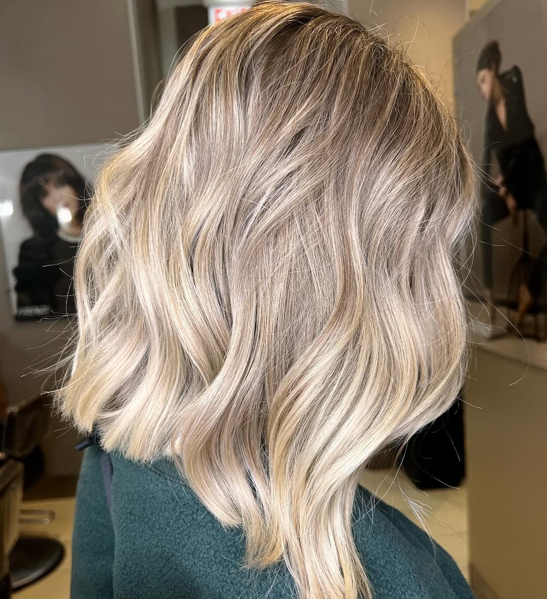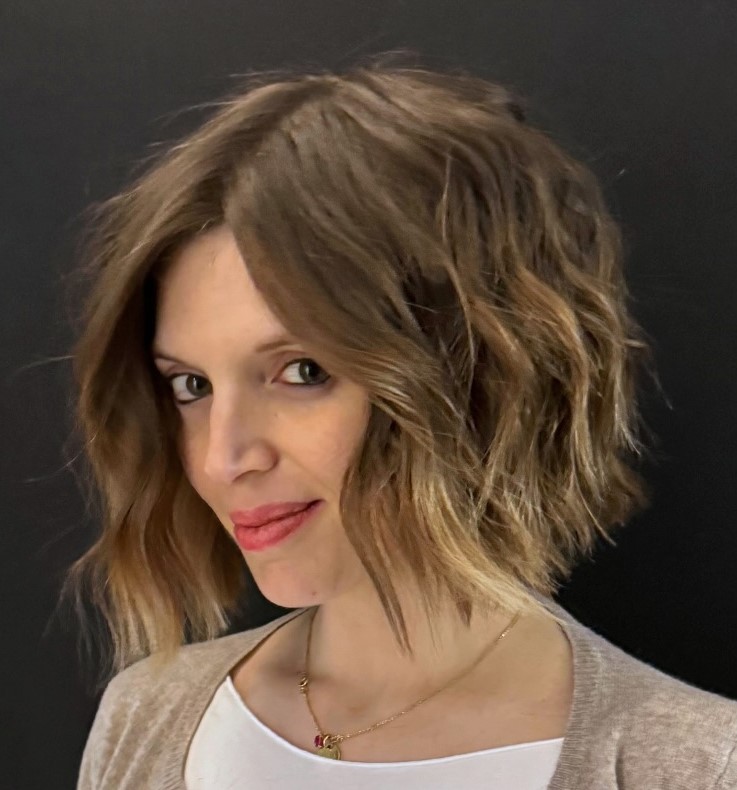 Make a wavy bob hairstyle your own with the help of some expert color that is tailored to your skin tone. This beautiful balayage pairs well with her slightly tanned complexion because the ash hues create a good contrast and won’t add any ruddiness.