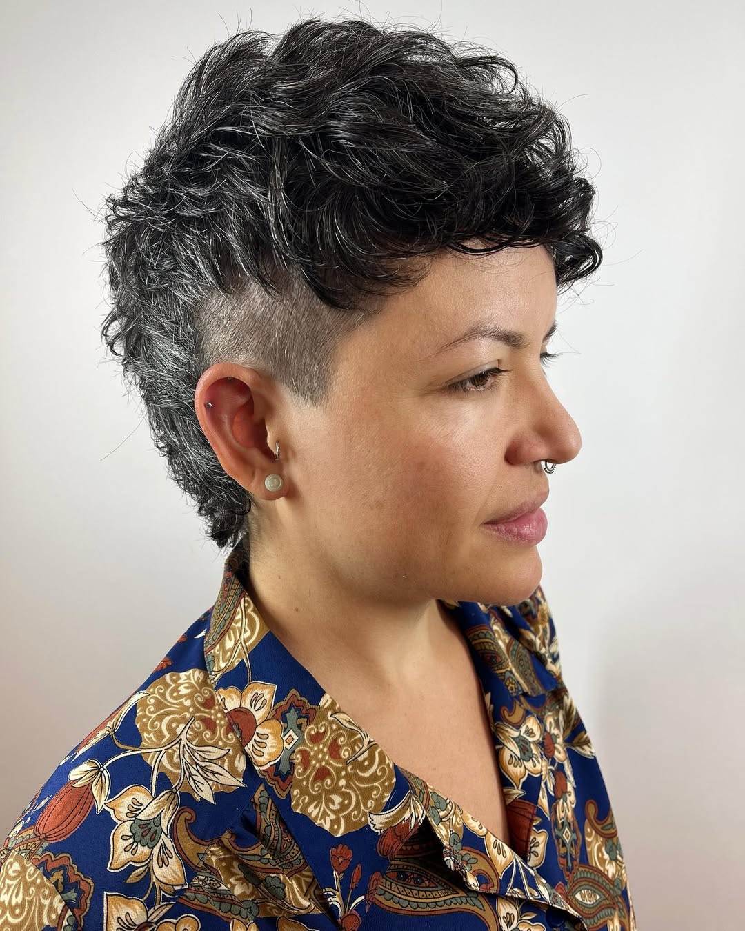 Shear the underlayer of hair, fading it around the ear line, but leave some curls to be wild up top. This look is edgy and expressive, and also super simple to maintain on a daily basis. This sassy cut has a youthful feel, but it can be worn at any age with confidence.