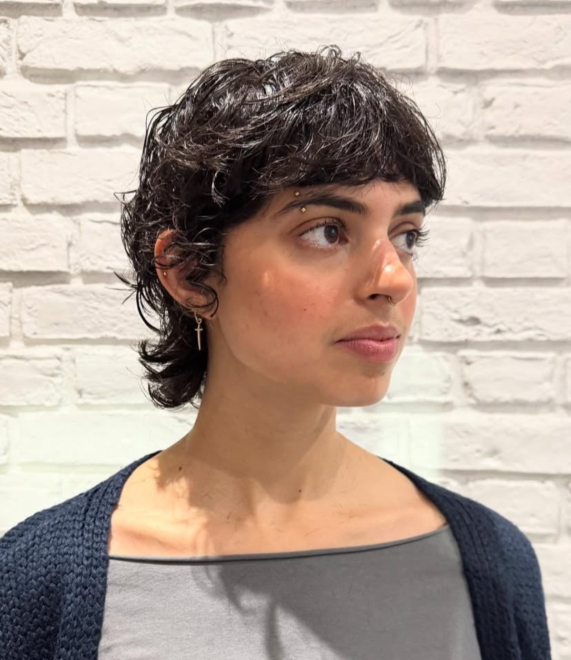Keep things short but fun with this hairstyle that takes advantage of every perk your naturally curly hair has to offer. Starting with a carefully coifed front fringe, the remaining hair is spiked and styled in a wild upward direction.