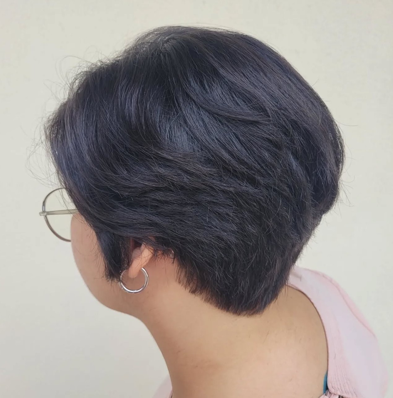 It might not look like your usual short layered style, and that’s exactly what makes it so special. The stacked layers throughout the crown and the soft sweeping bangs give such a laid-back flair. Perfect for women with long faces who need a stylish, low-maintenance hairdo.