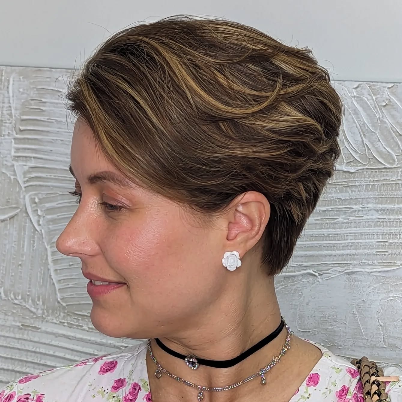 The pixie bob cut is super versatile, as it fits both younger fashionistas and women over 60. Bronde-toned gradual layers complement the brown base and add airiness and volume to the style, which is awesome for ladies with thin hair.