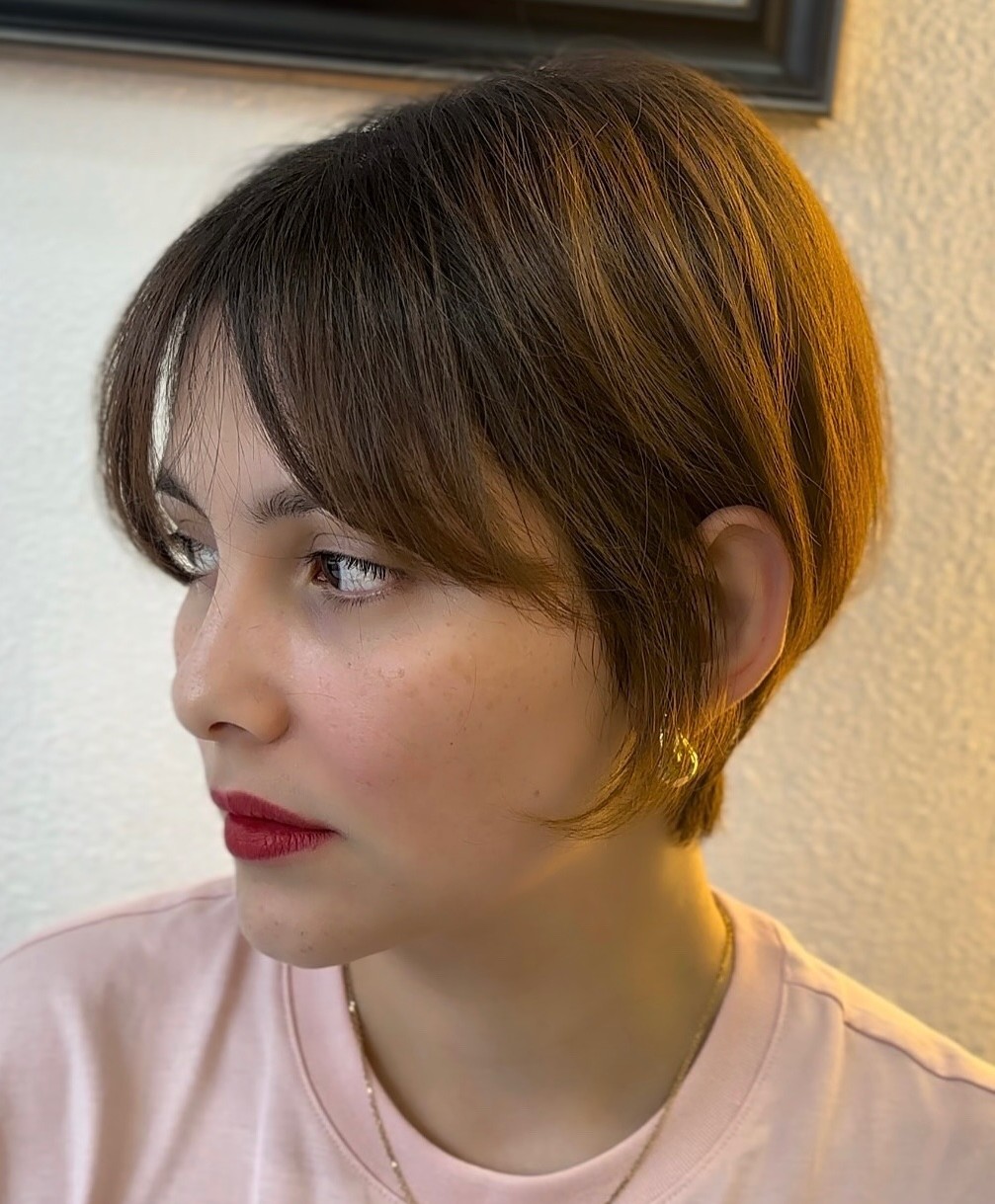 It might not look like your usual short layered style, and that’s exactly what makes it so special. The stacked layers throughout the crown and the soft sweeping bangs give such a laid-back flair. Perfect for women with long faces who need a stylish, low-maintenance hairdo.