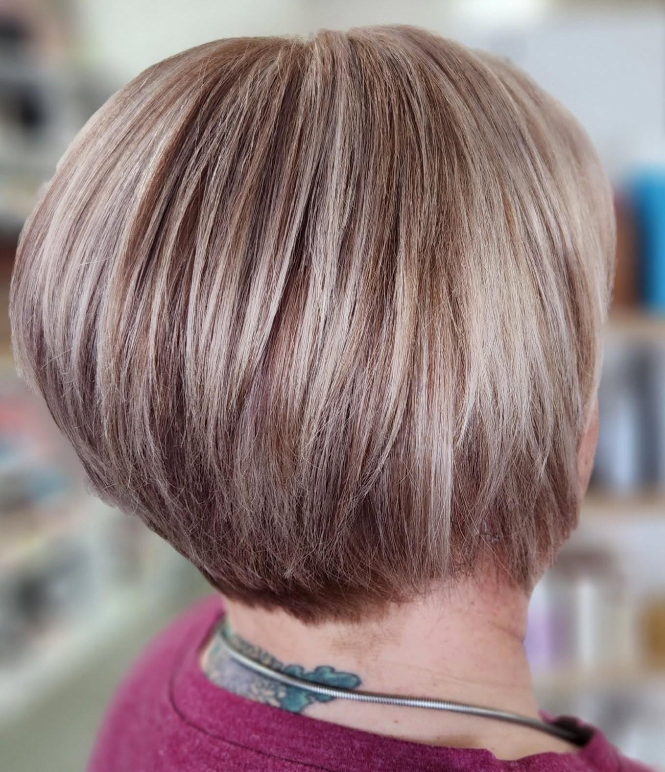 A stacked inverted cut is perfect for women with fine hair because it creates thickness throughout the crown of the head. Balayage highlights in the front of the style create a sense of weightlessness so that it doesn’t seem too dense.