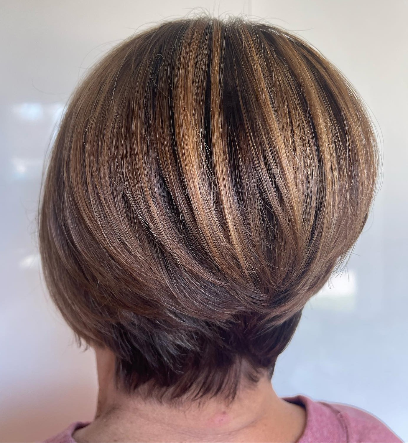 A stacked inverted cut is perfect for women with fine hair because it creates thickness throughout the crown of the head. Balayage highlights in the front of the style create a sense of weightlessness so that it doesn’t seem too dense.