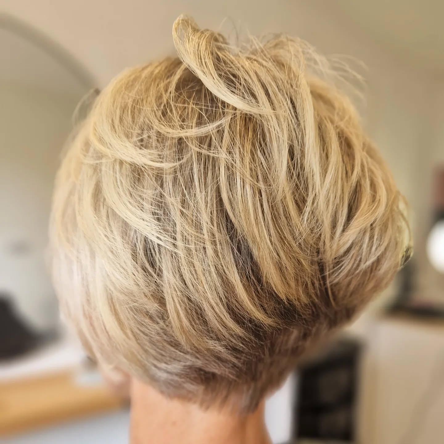 It might not look like your usual short layered style, and that’s exactly what makes it so special. The stacked layers throughout the crown and the soft sweeping bangs give such a laid-back flair. Perfect for women with long faces who need a stylish, low-maintenance hairdo.
